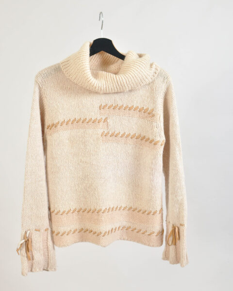 Vintage 00s Beige Turtleneck Jumper with Leather Details | S-M