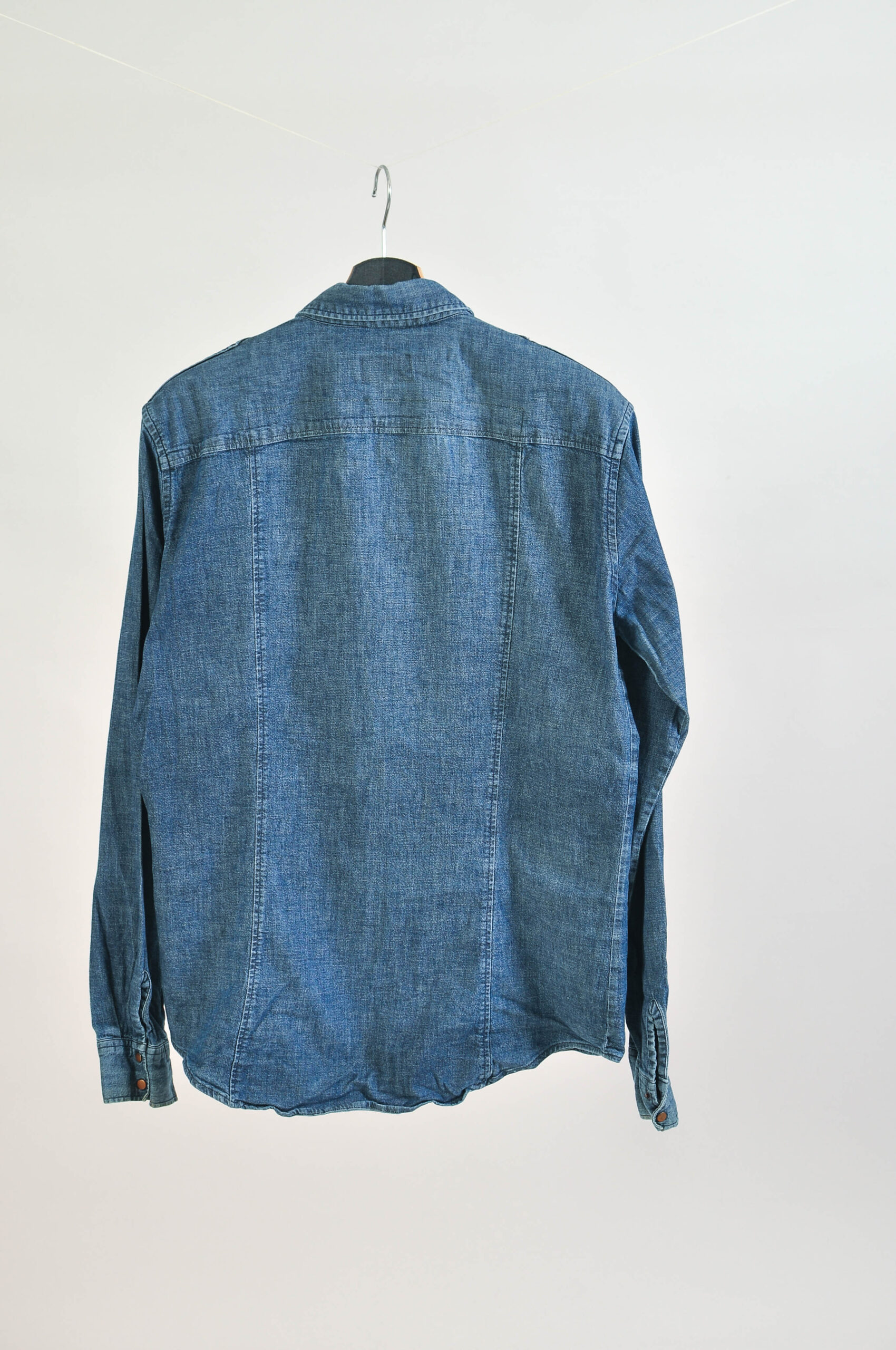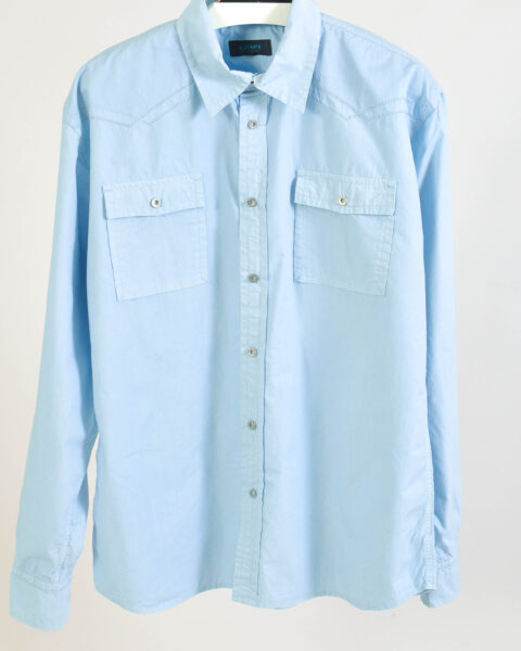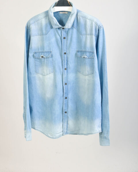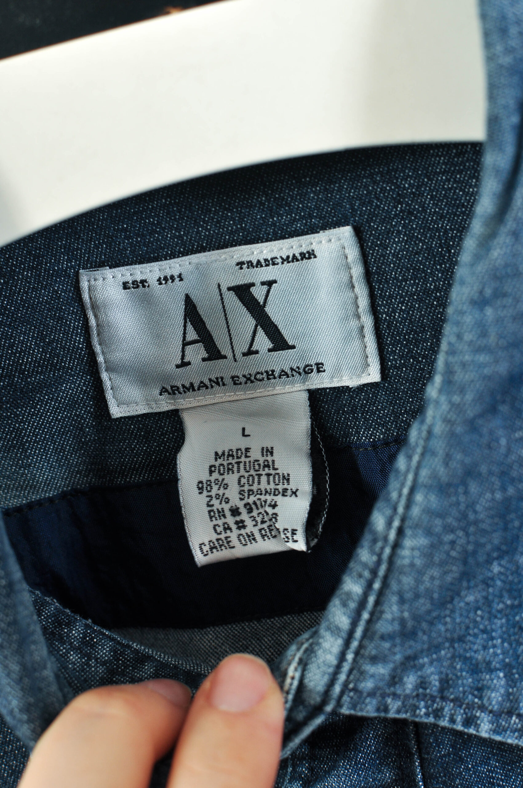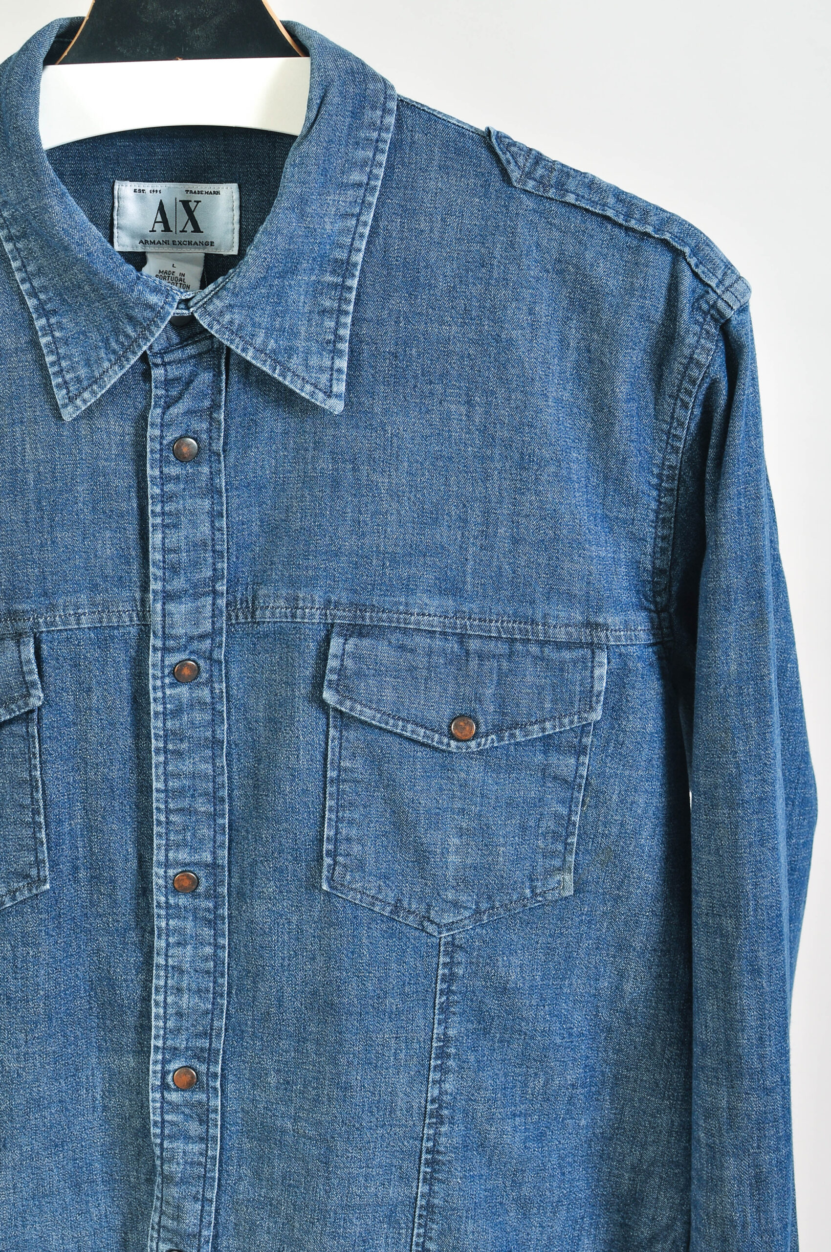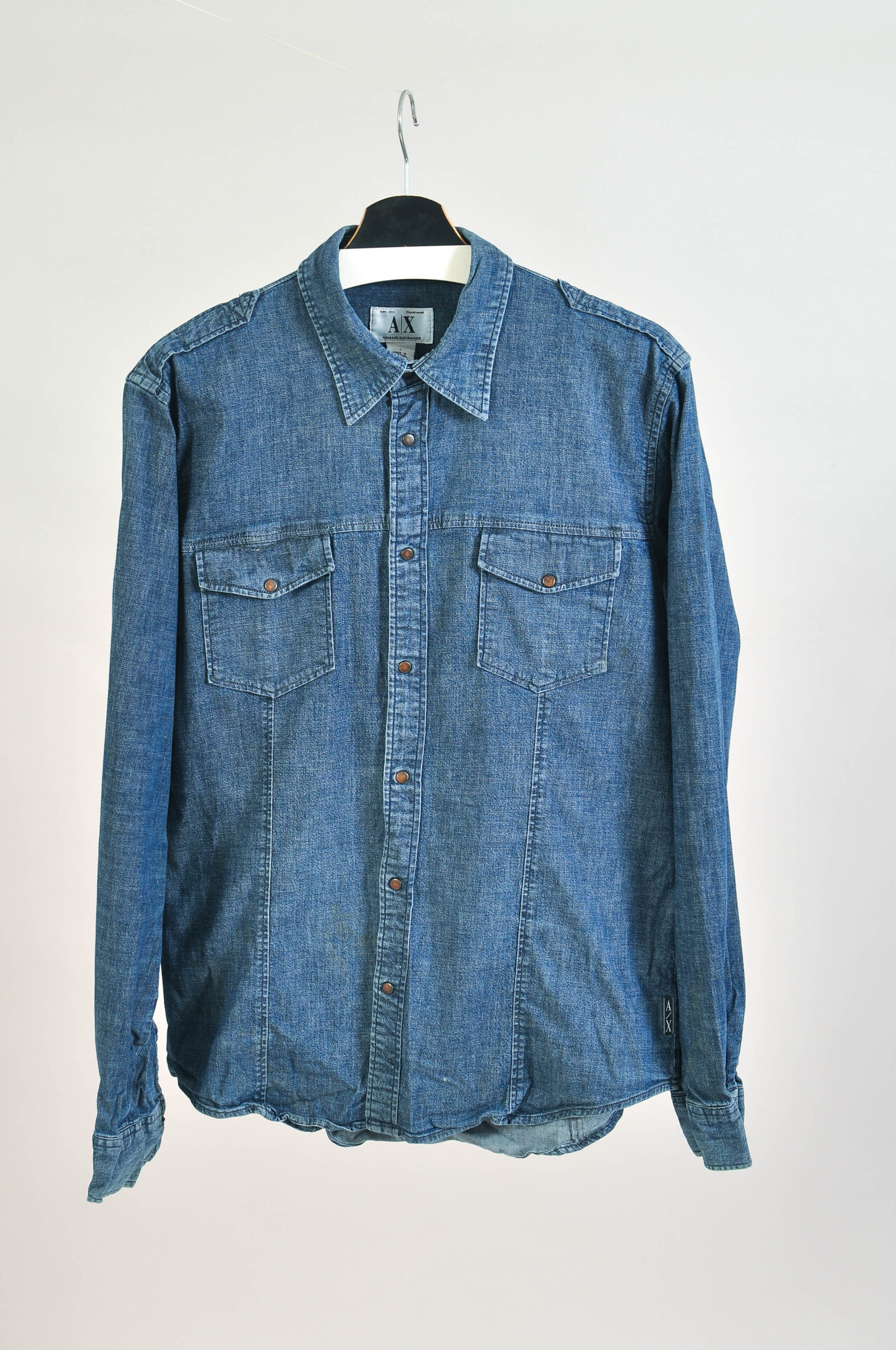 Stylish vintage 00s denim shirt by Armani Exchange featuring a classic early-2000s design with a modern slim feel thanks to the cotton–spandex blend. This versatile piece reflects the signature casual luxury aesthetic of the brand and works perfectly for both casual and smart-casual outfits.
