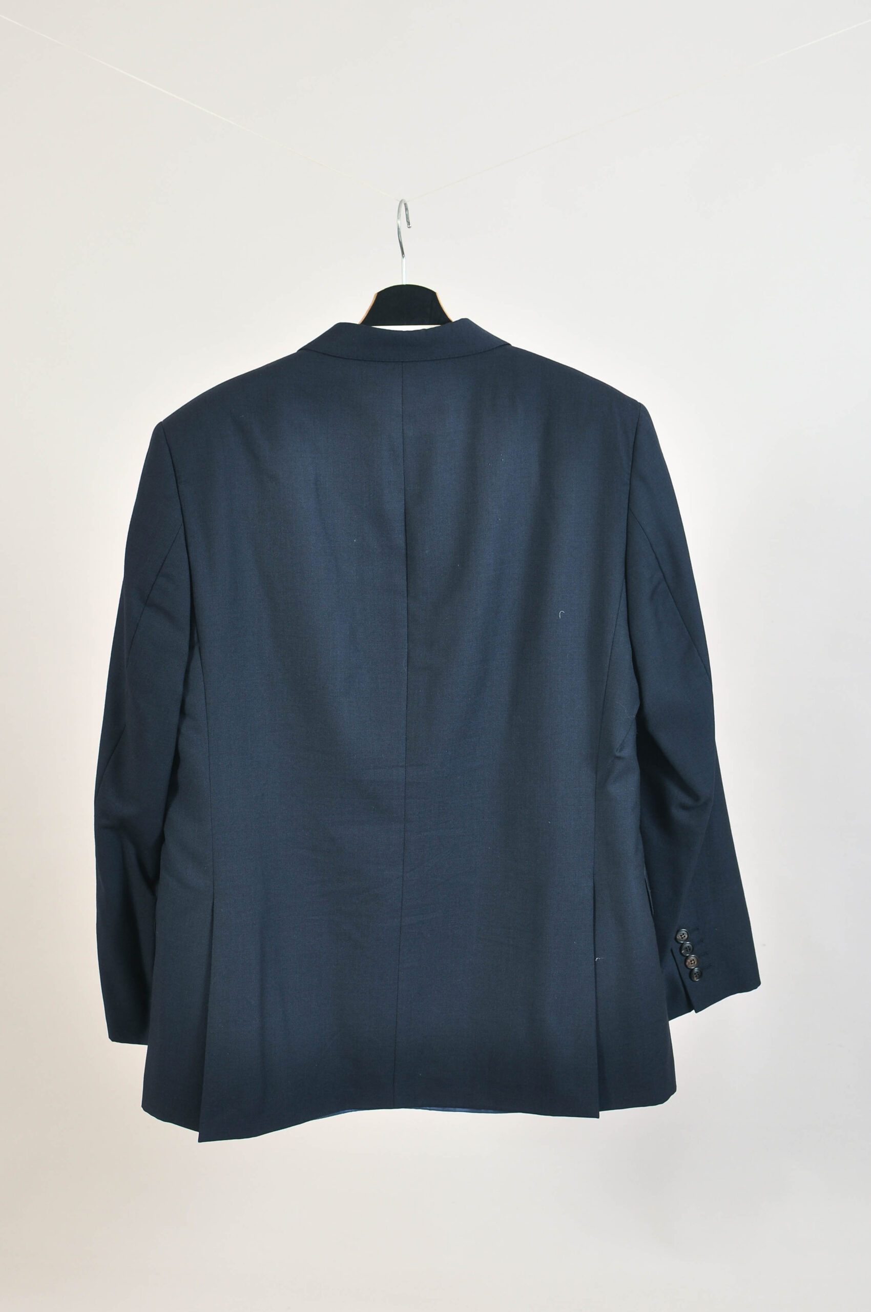 Fully lined with a smooth poly-viscose blend, it features notched lapels, double inside labels, and minimal signs of wear.