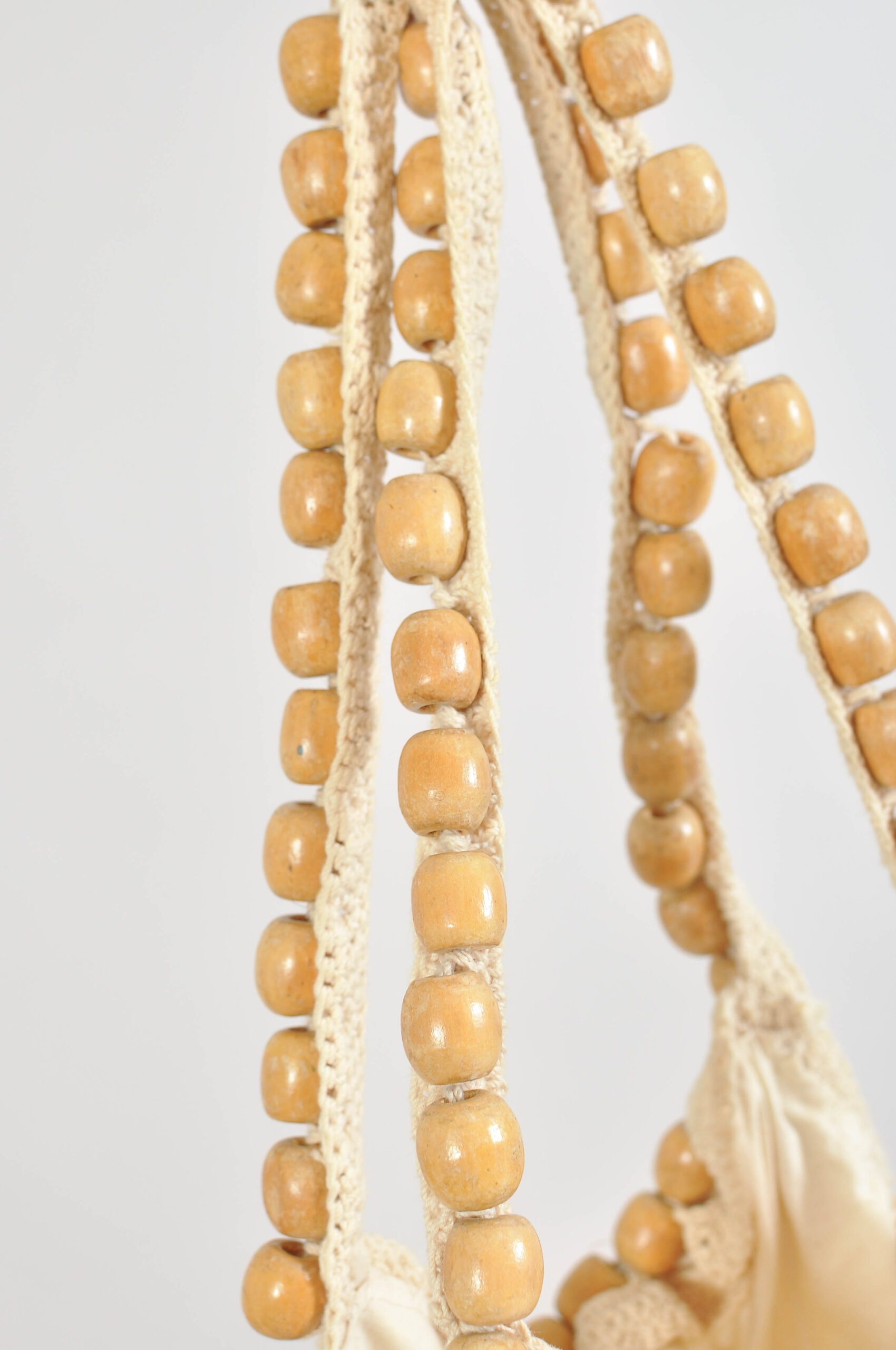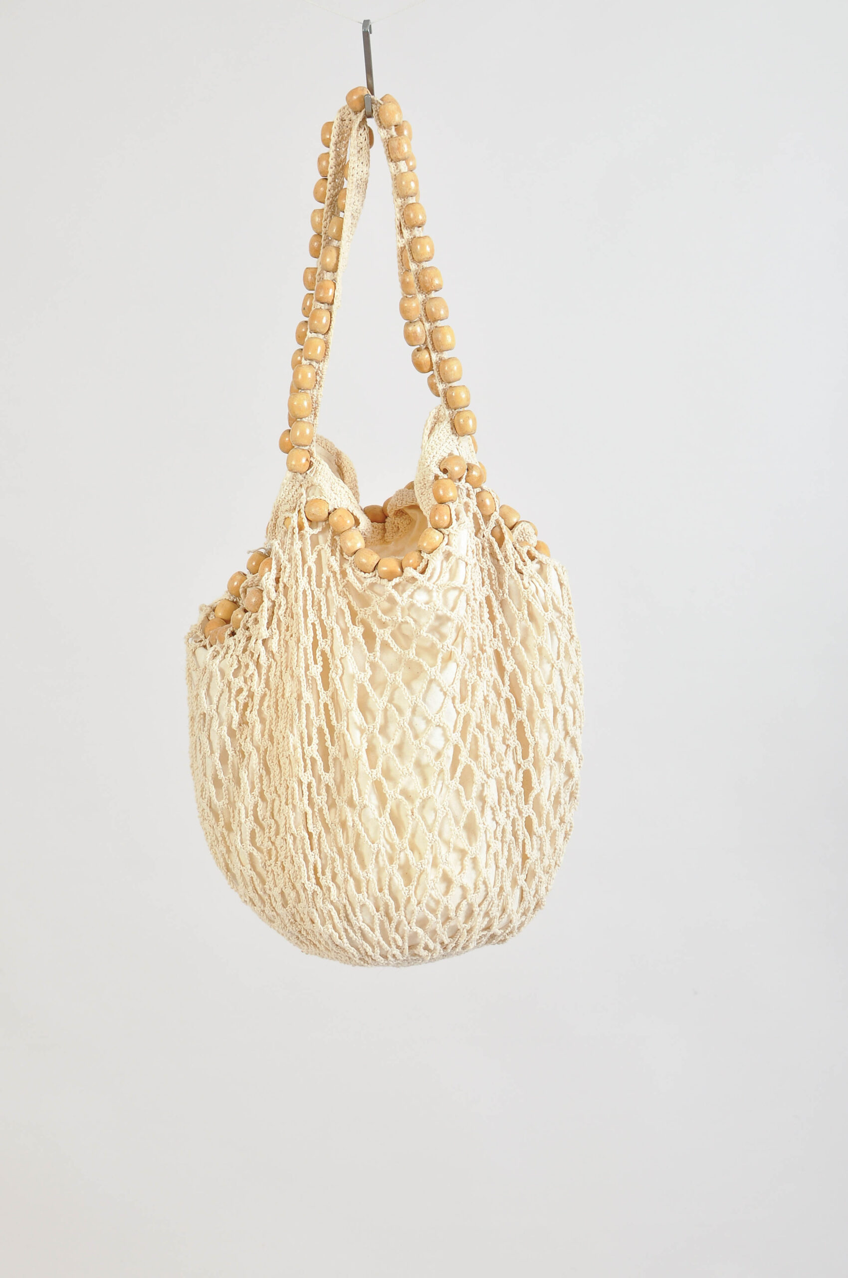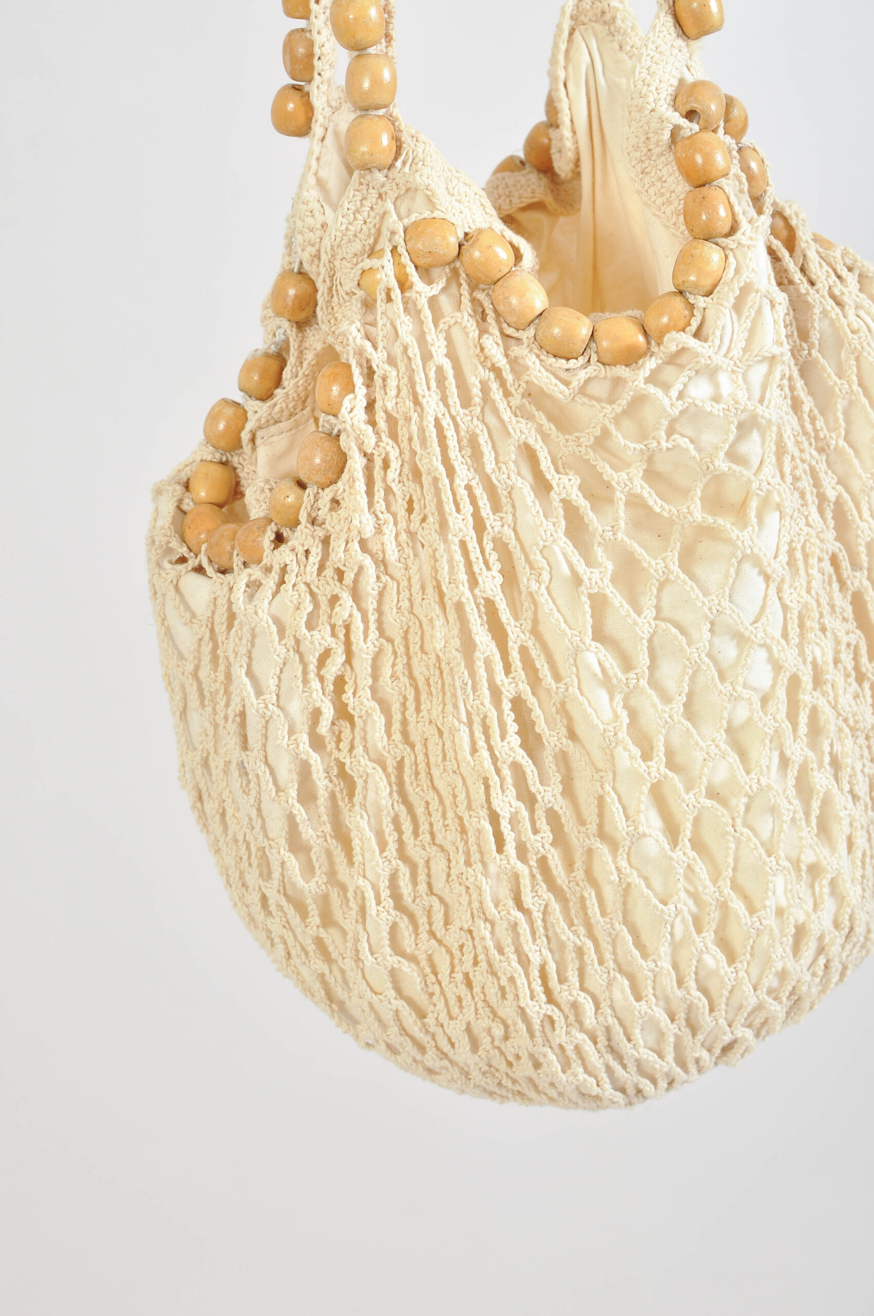 Elevate your style with this vintage 00s crocheted bag featuring a distinctive wooden ball strap. The perfect mix of bohemian and Y2K aesthetic, this unique piece adds a playful retro touch to any outfit.