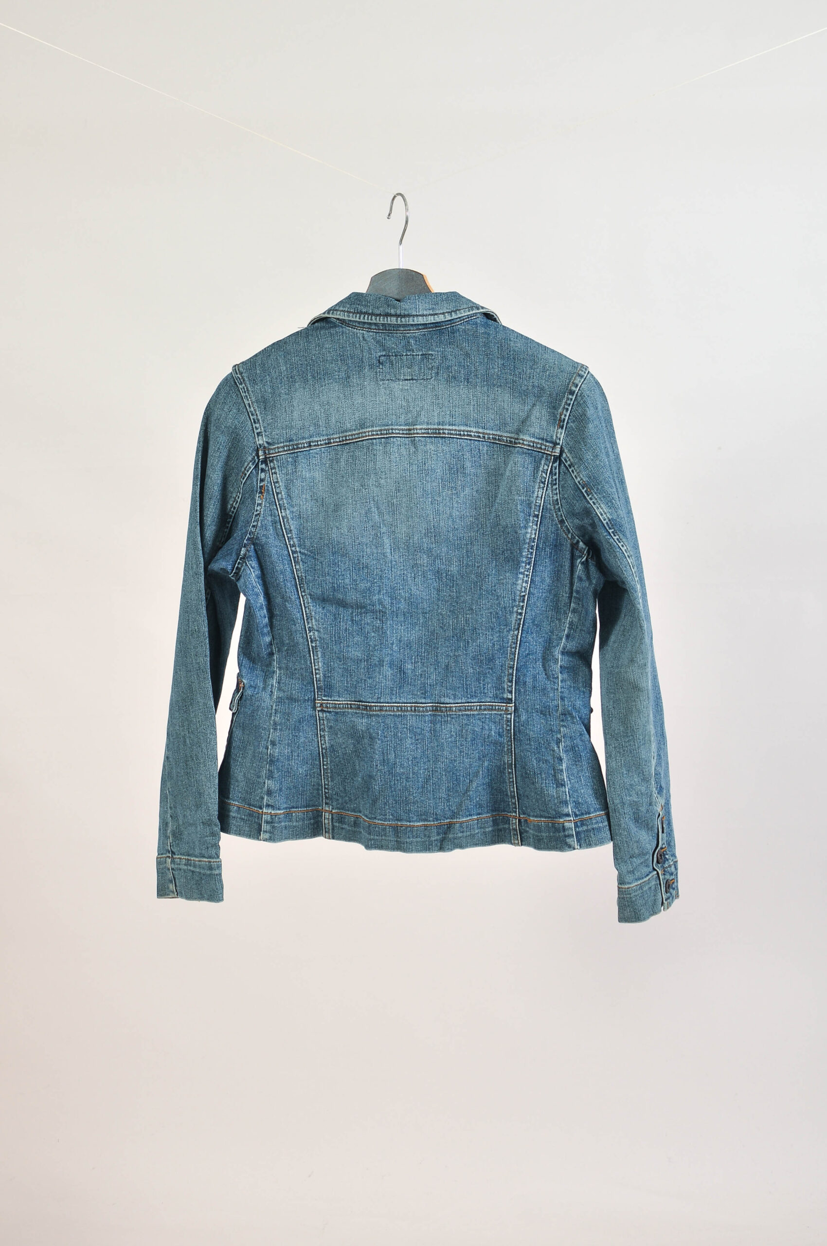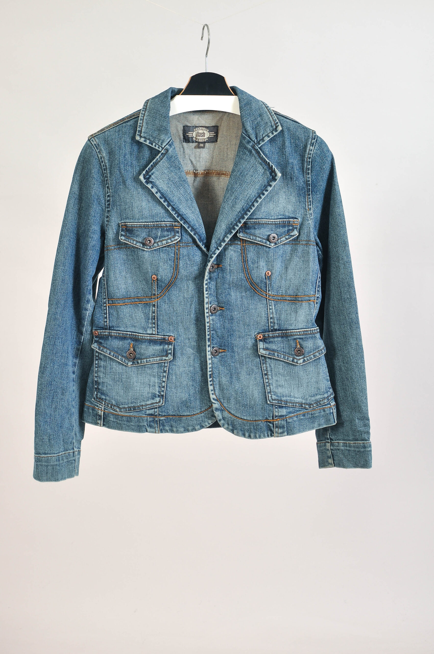 Stylish vintage 00s denim blazer jacket by Flash featuring a tailored silhouette with a casual denim finish. A perfect blend of smart and relaxed style, ideal for versatile everyday outfits.