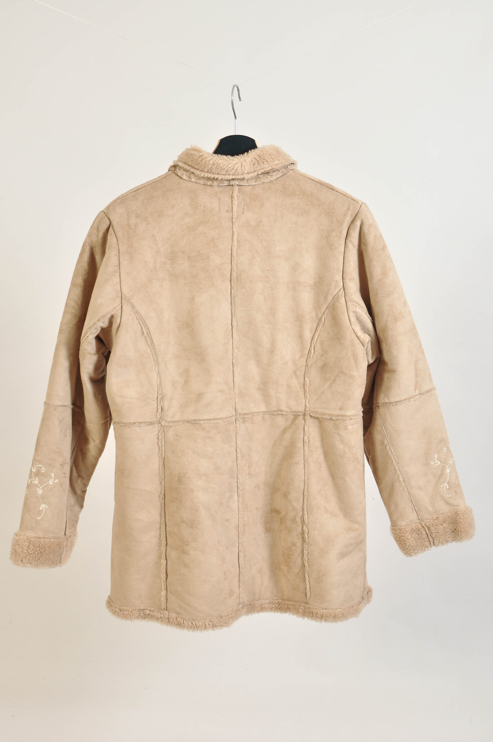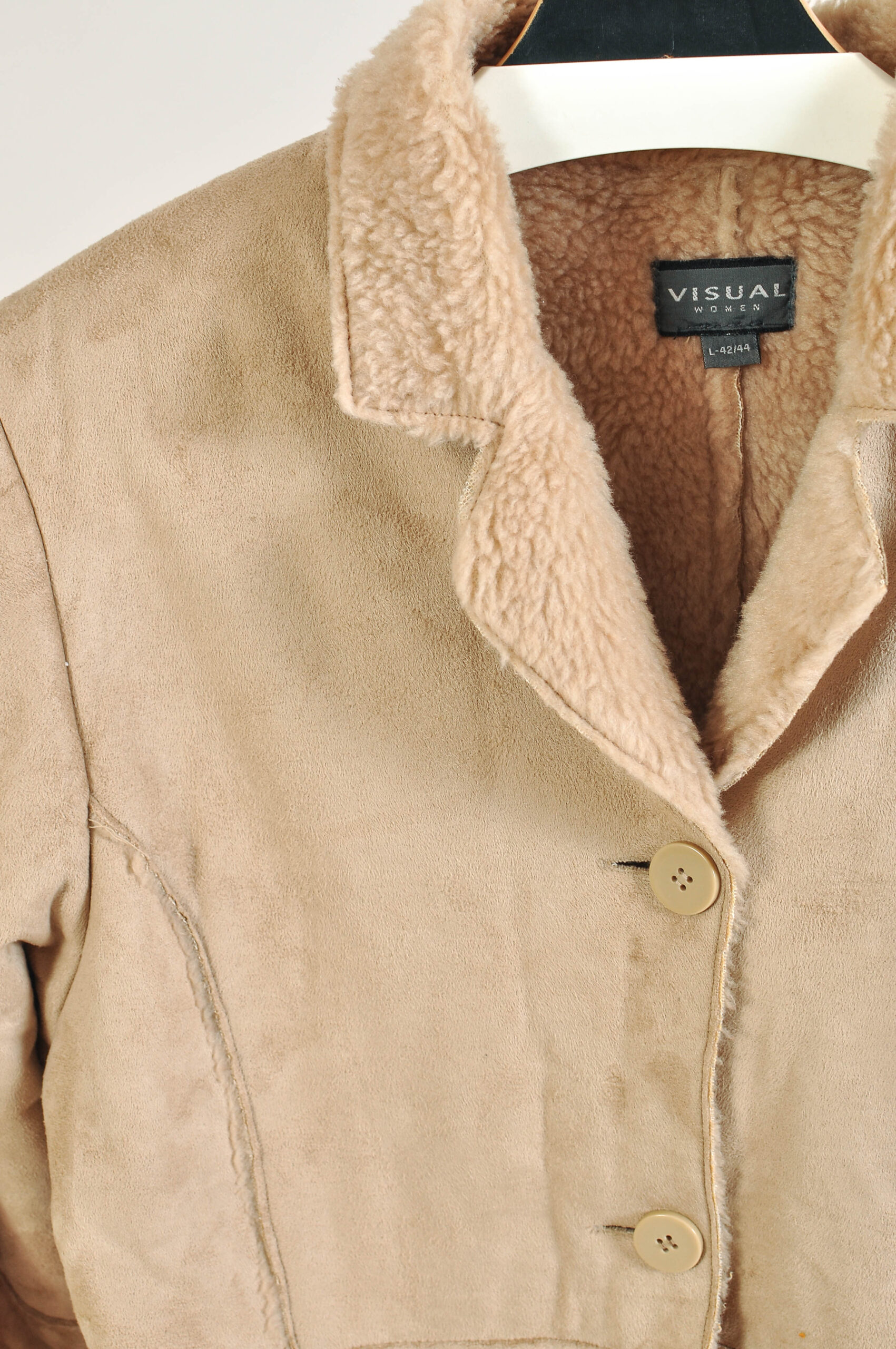 Stay warm in style with this Vintage 00s Faux Shearling Coat from Visual Women. Crafted from faux suede leather with a soft faux shearling lining, this coat brings Y2K charm with both comfort and retro edge.