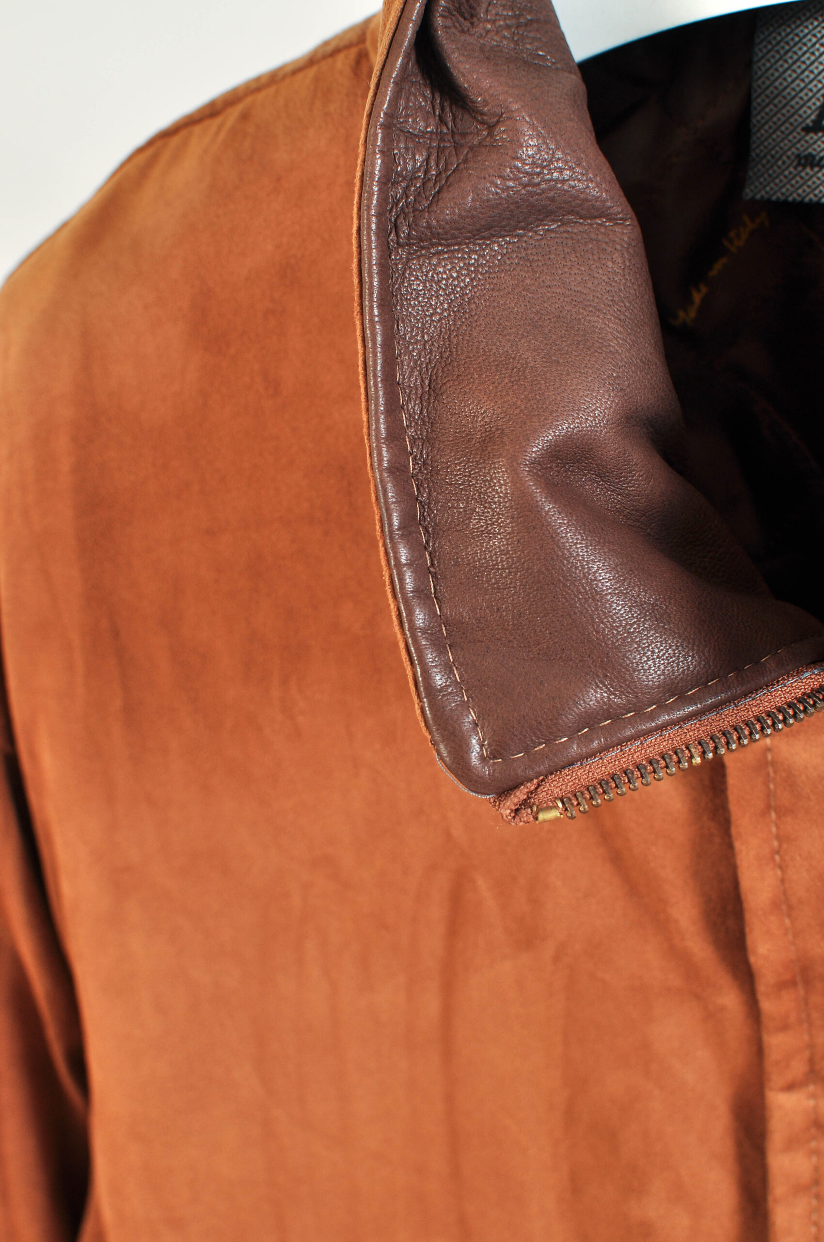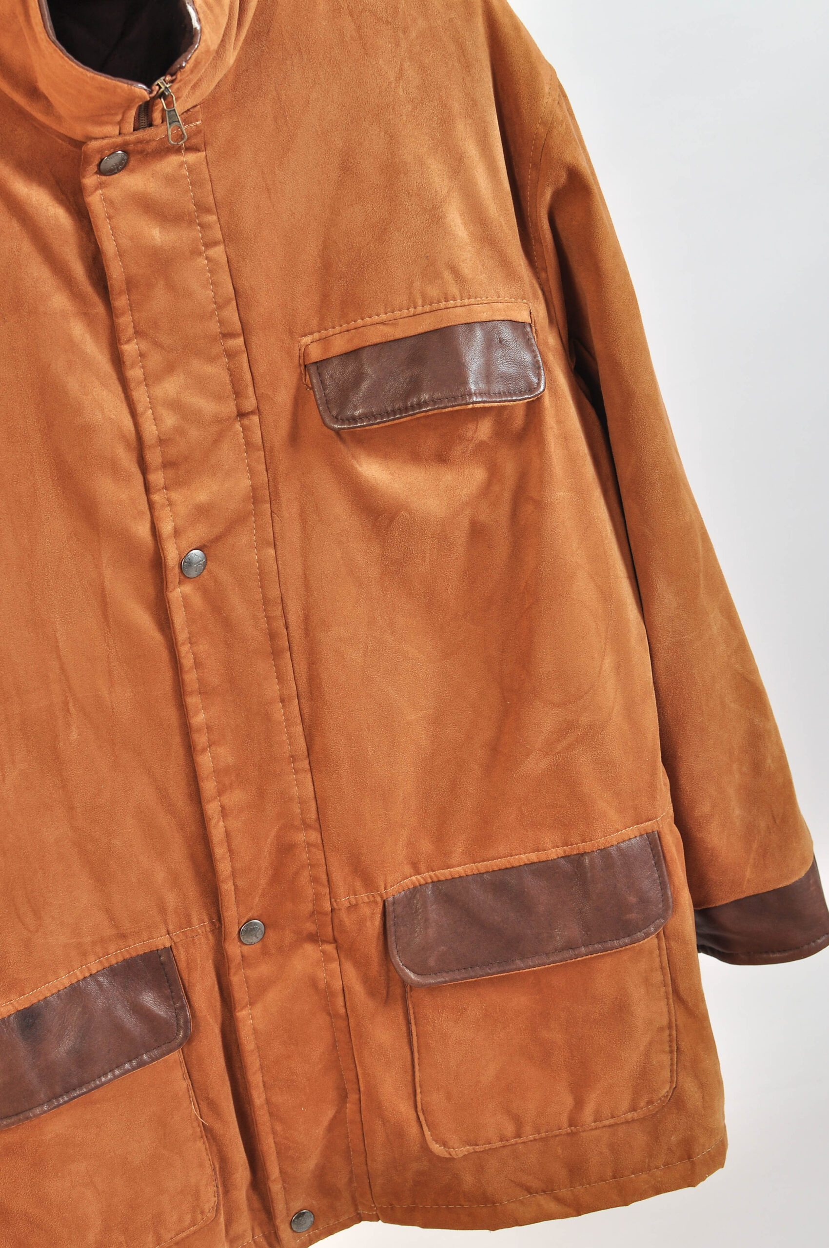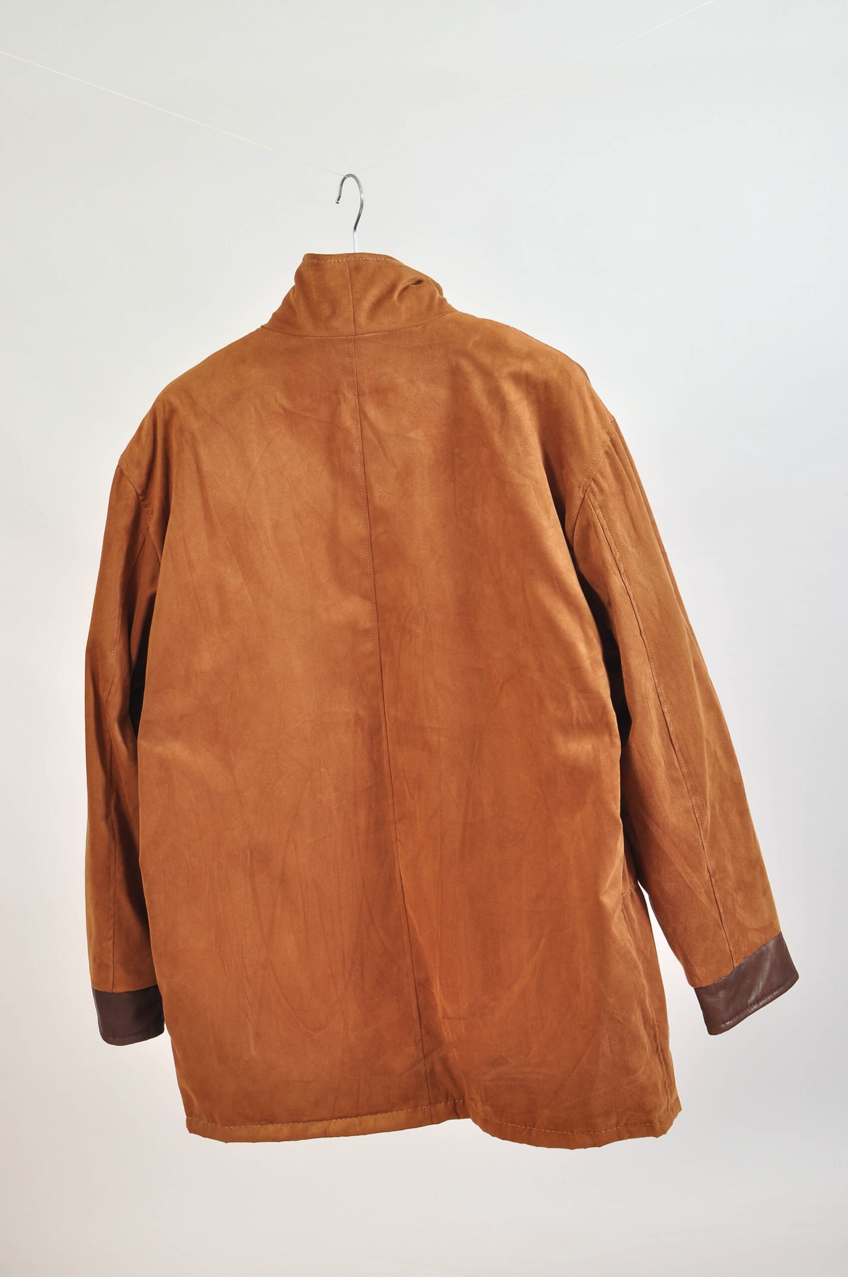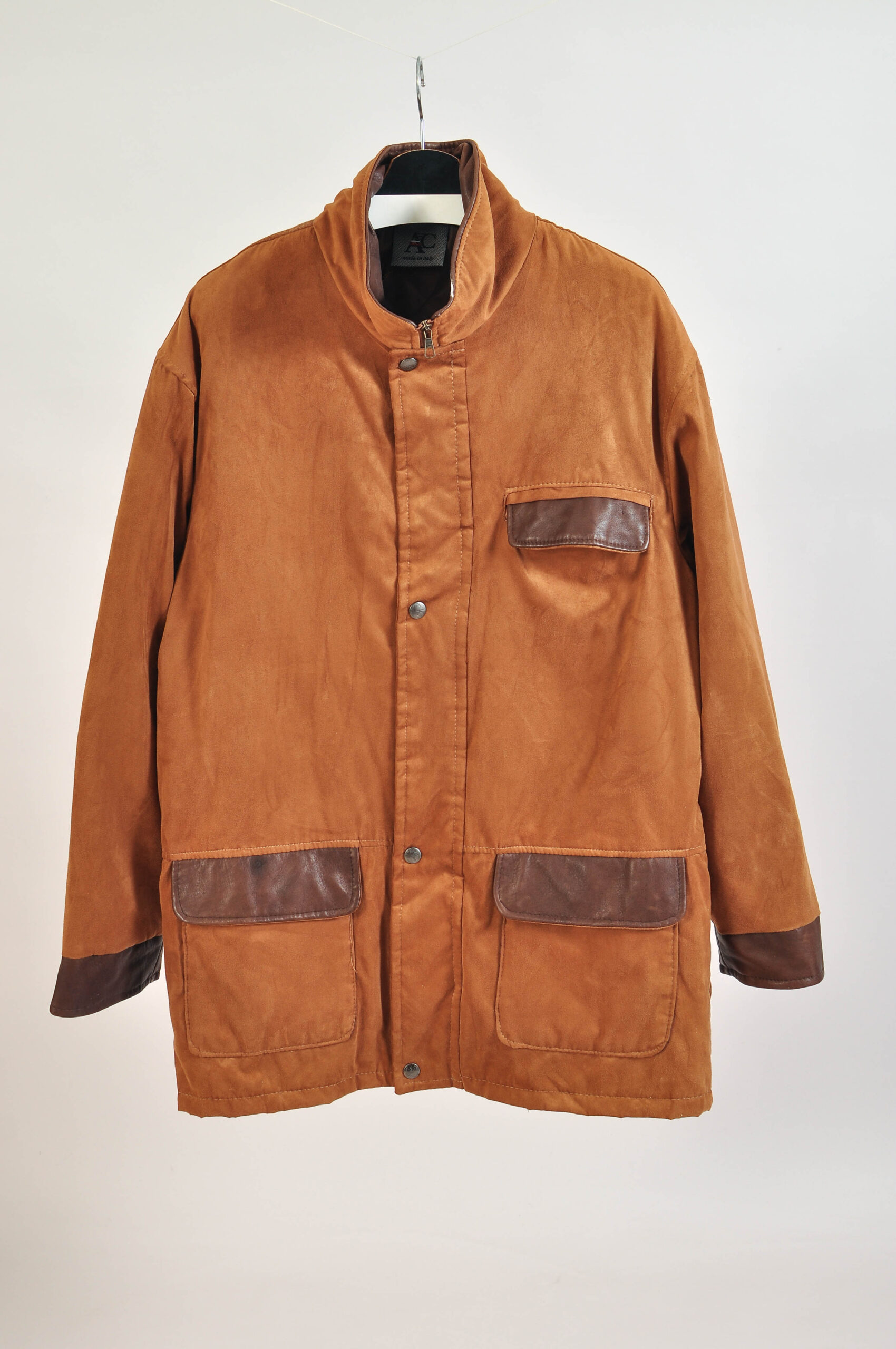 Stylish vintage 00s faux suede funnel neck jacket by AC, made in Italy, featuring a sleek silhouette with a distinctive high funnel neck for a modern, structured look. The soft faux suede texture adds a premium feel while staying versatile and easy to style.