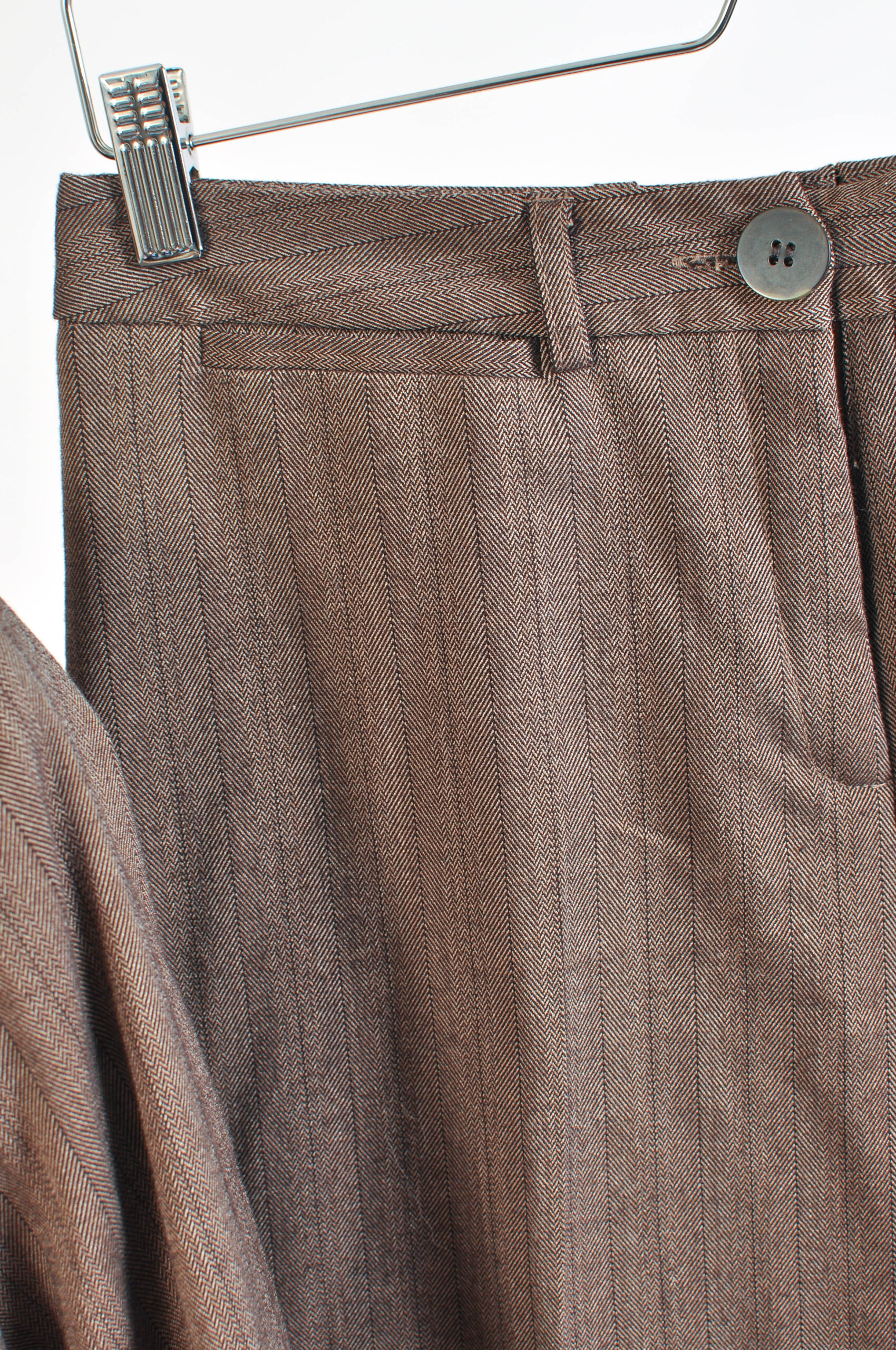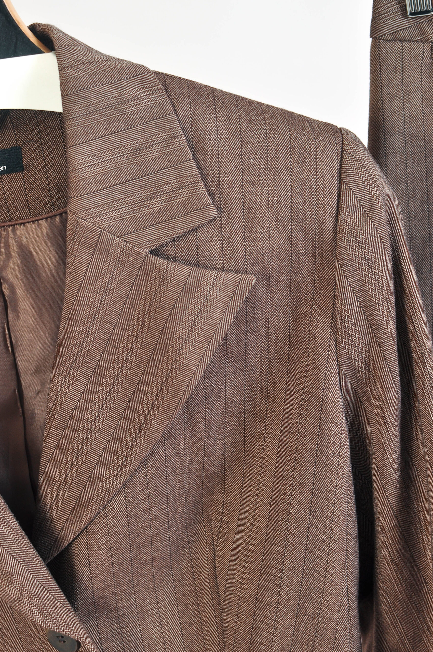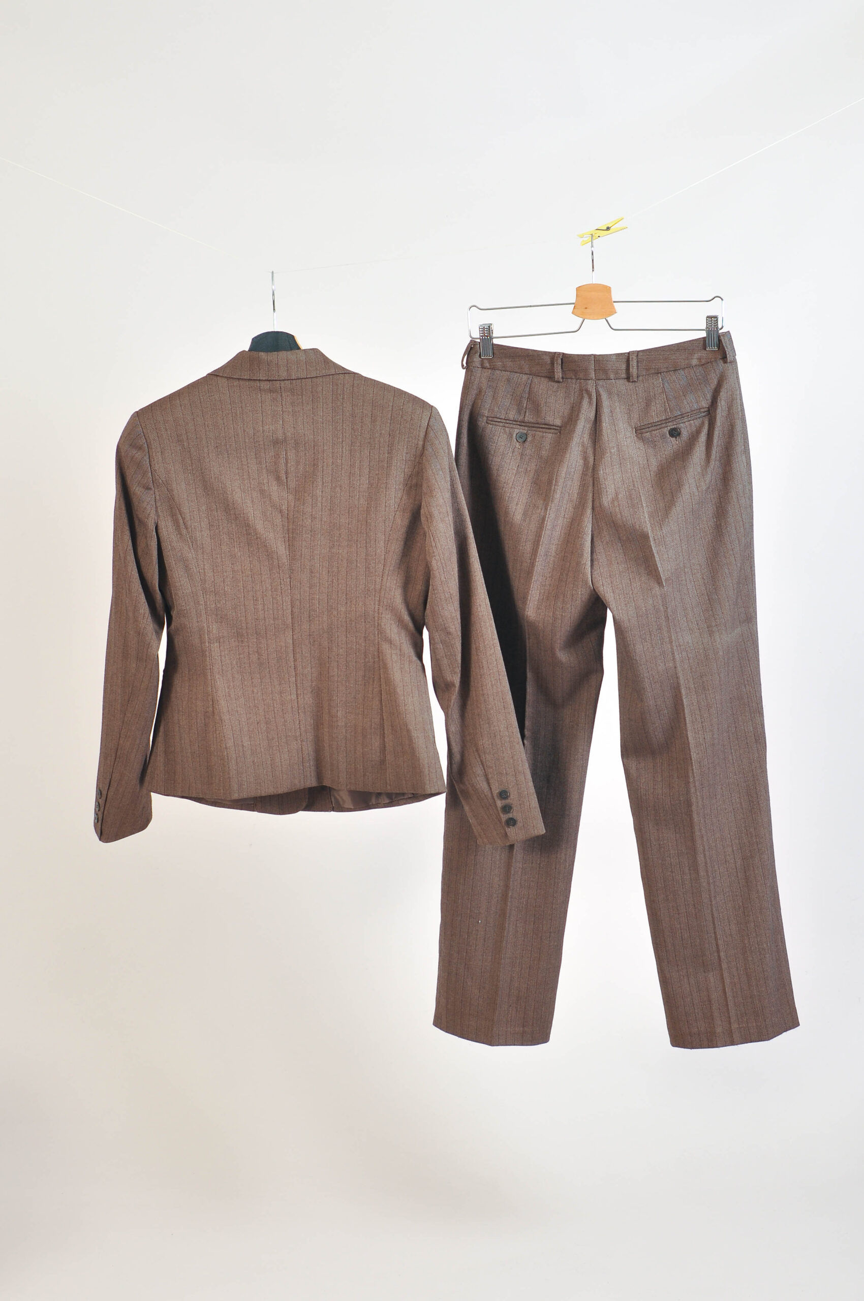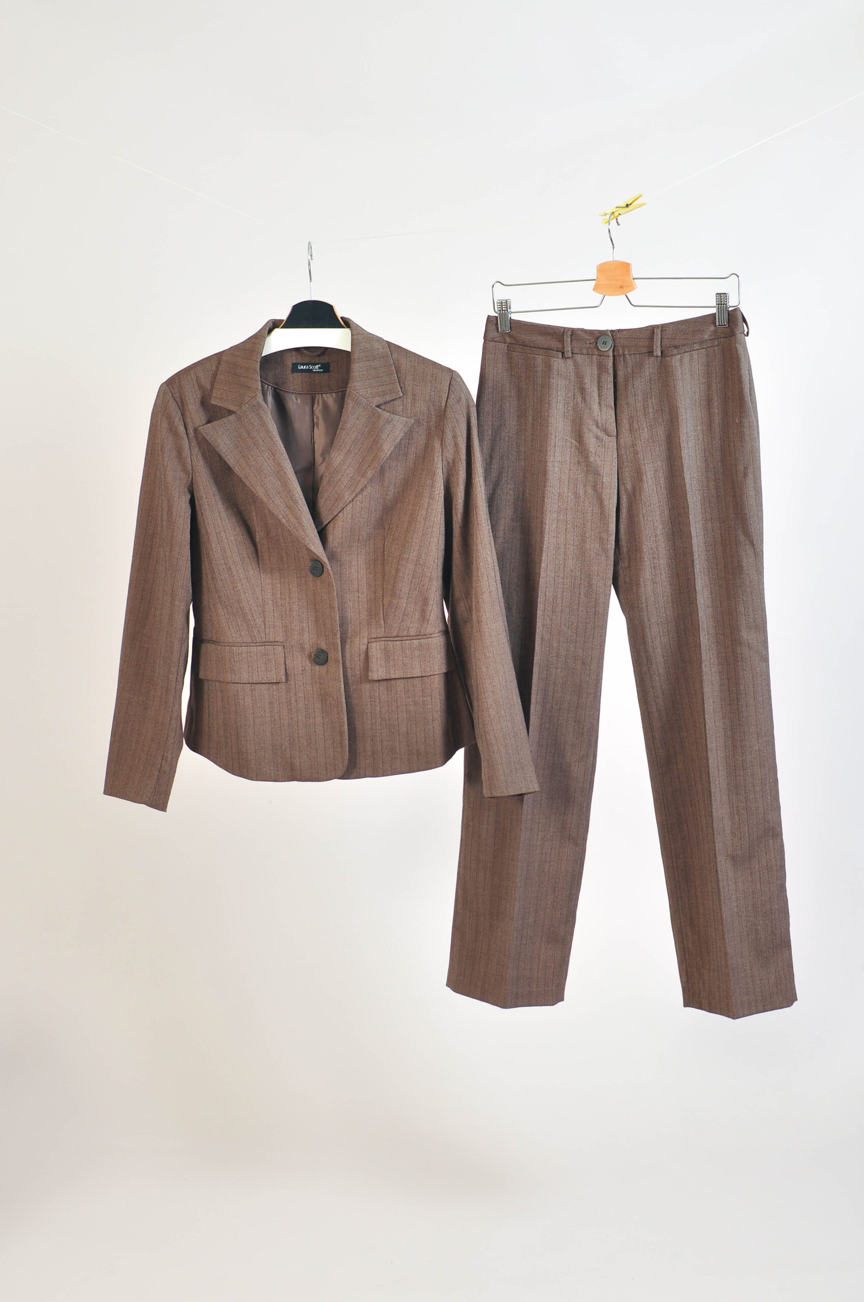 This vintage 2000s suit in a chic brown hue combines a tailored blazer with wide-leg trousers for a timeless look. Crafted to perfection, it offers versatile styling options for formal or smart-casual occasions.