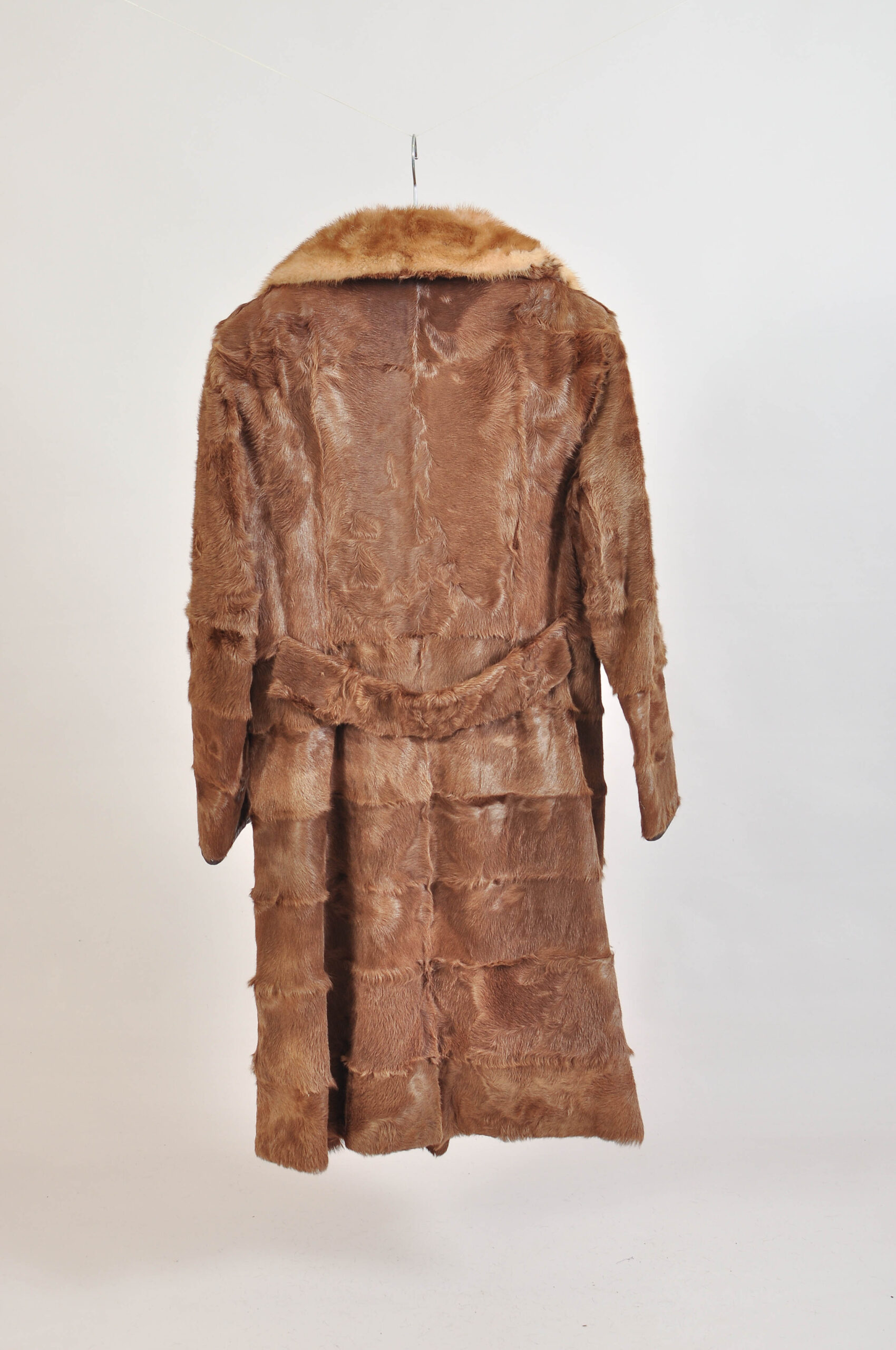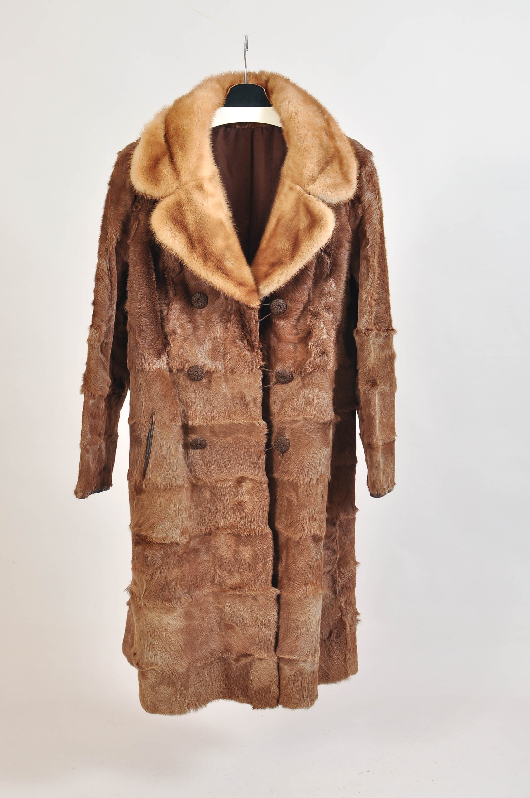 Step into timeless elegance with this vintage late 1970s to early 1980s real pony fur coat featuring a luxurious contrast collar. A true statement piece with a double-breasted track silhouette, it showcases natural signs of wear typical of authentic vintage.