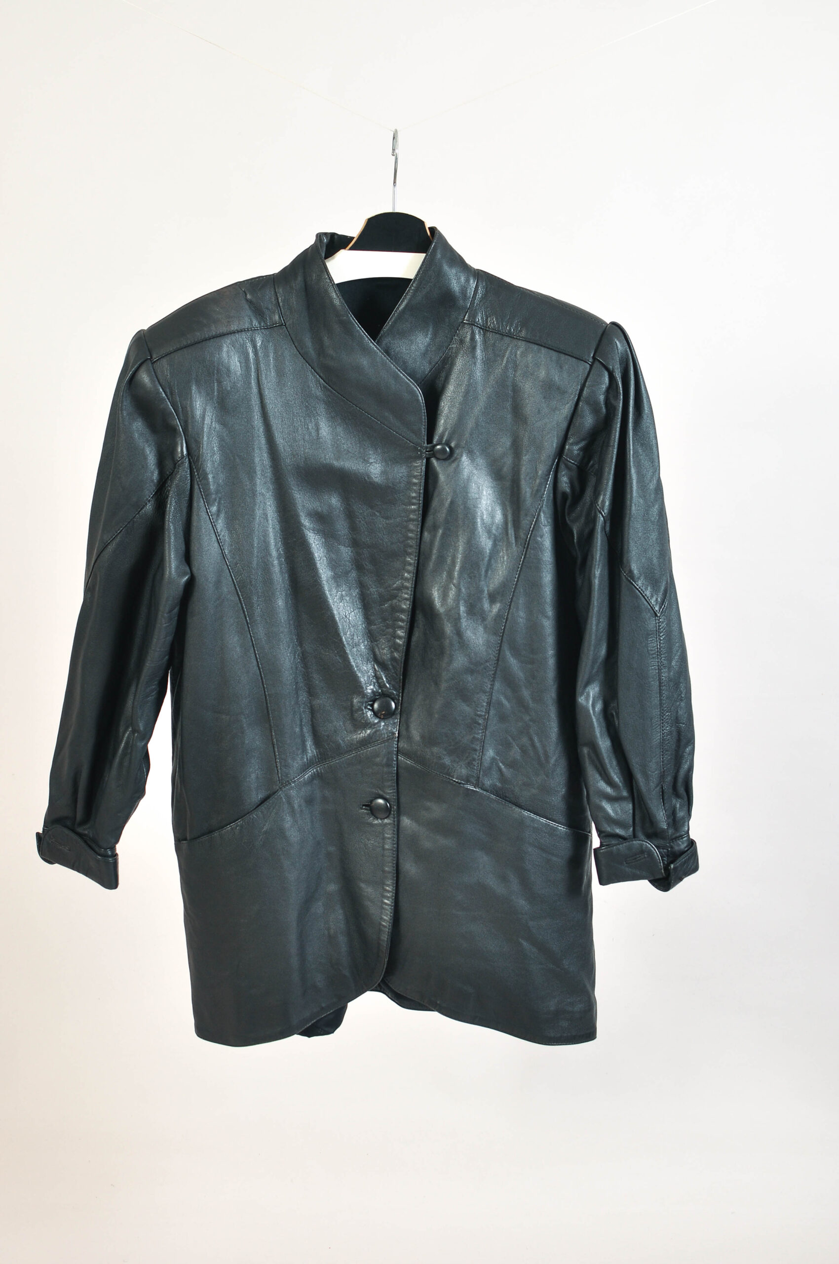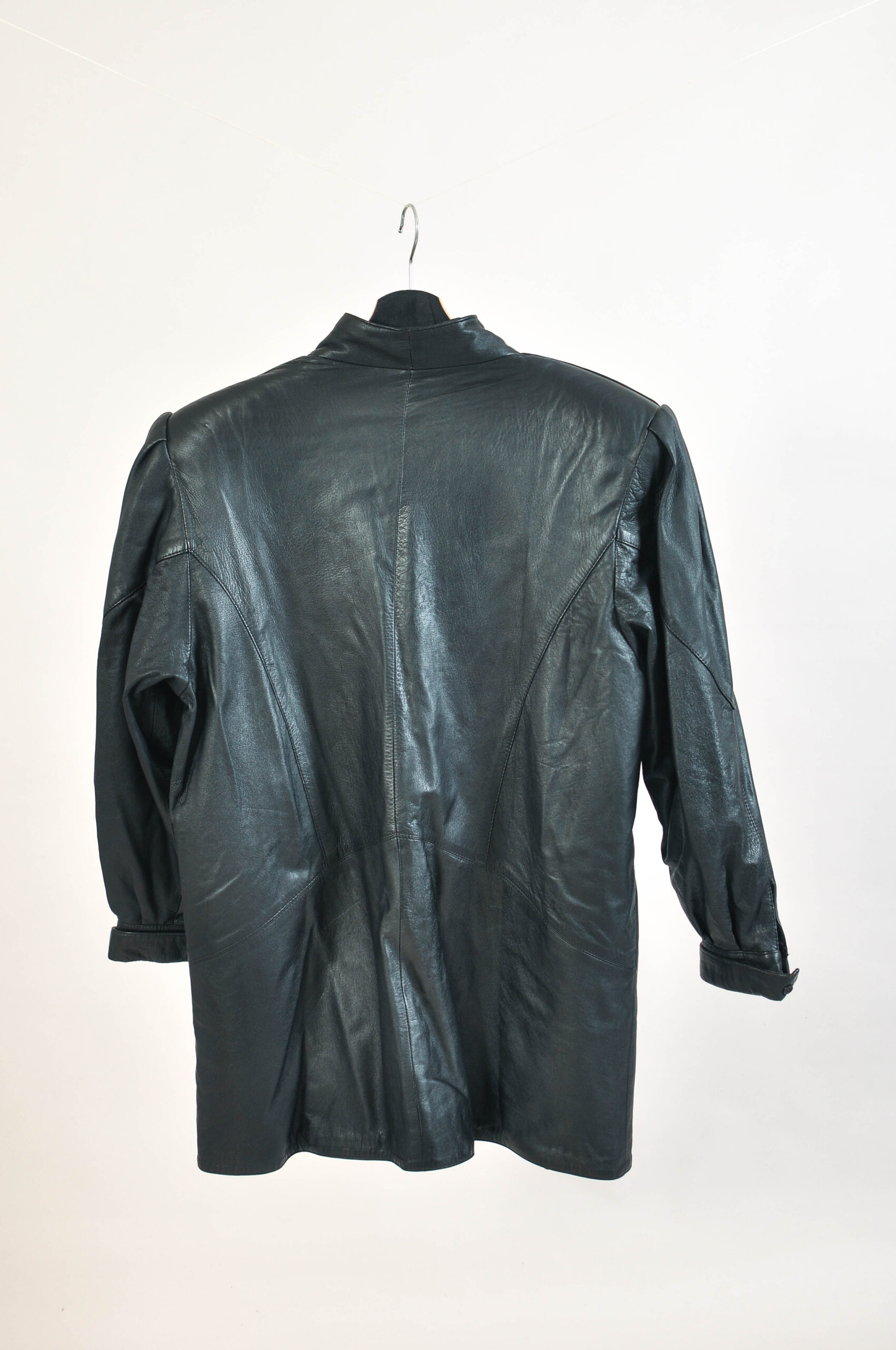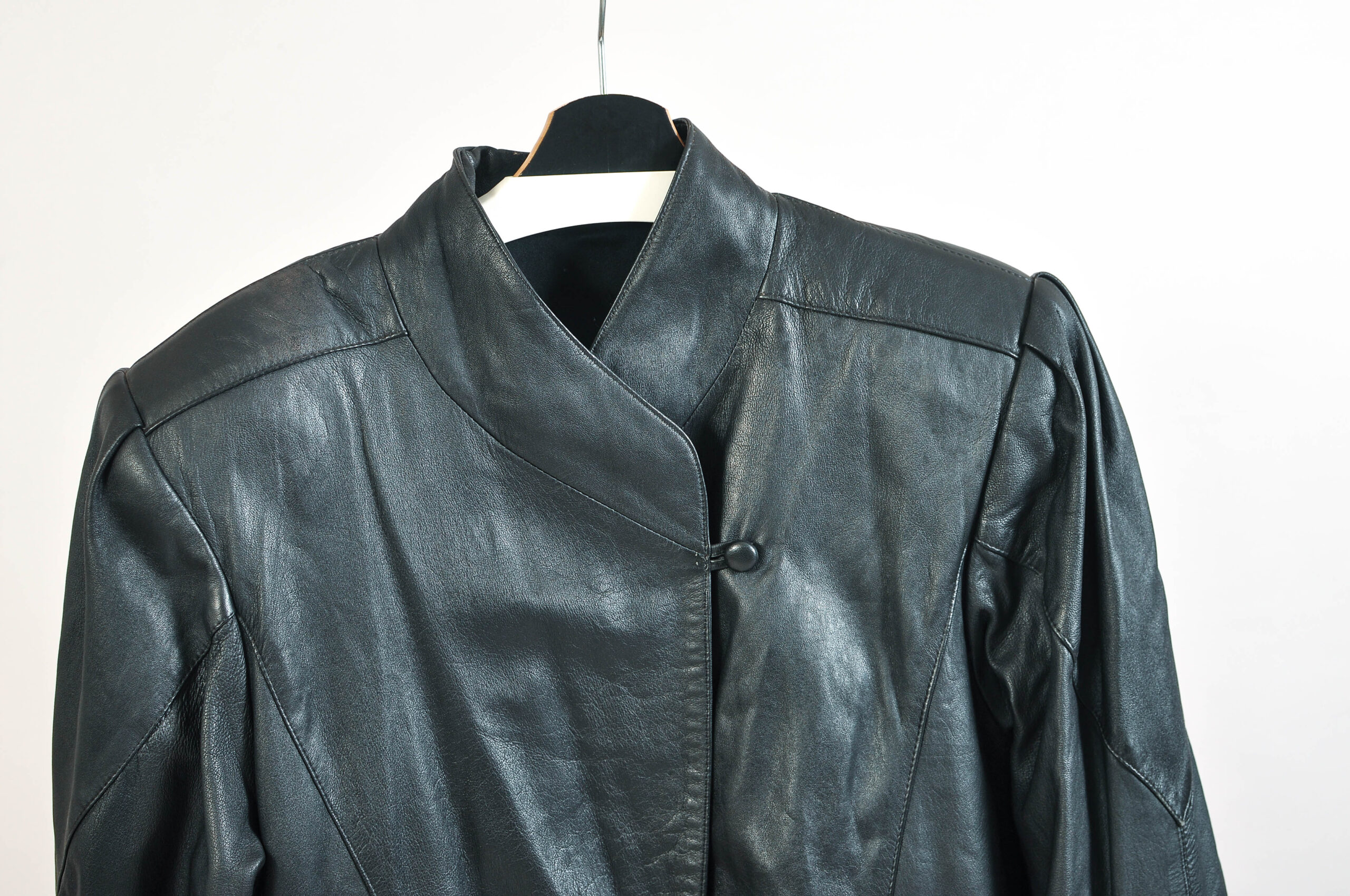 Vintage 80s real leather coat in black. Crafted from soft, high-quality genuine leather, this coat embodies classic 80s style with a timeless silhouette. There are signs of natural wear as to be expected with all vintage clothes.