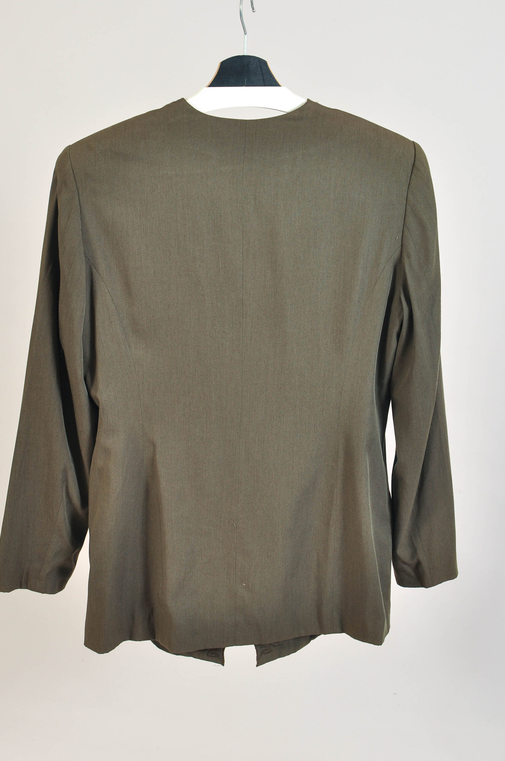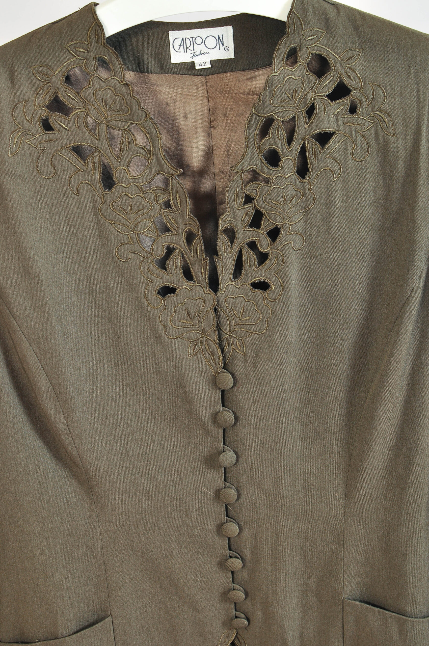Add a touch of timeless elegance to your wardrobe with this vintage 1980s embroidered jacket by Cartoon. Crafted in a rich dark green shade, this jacket features delicate embroidery that highlights its sophisticated retro charm. Made from a 70% viscose blend, it offers a soft, smooth feel with a beautiful drape—perfect for both casual and dressy styling.