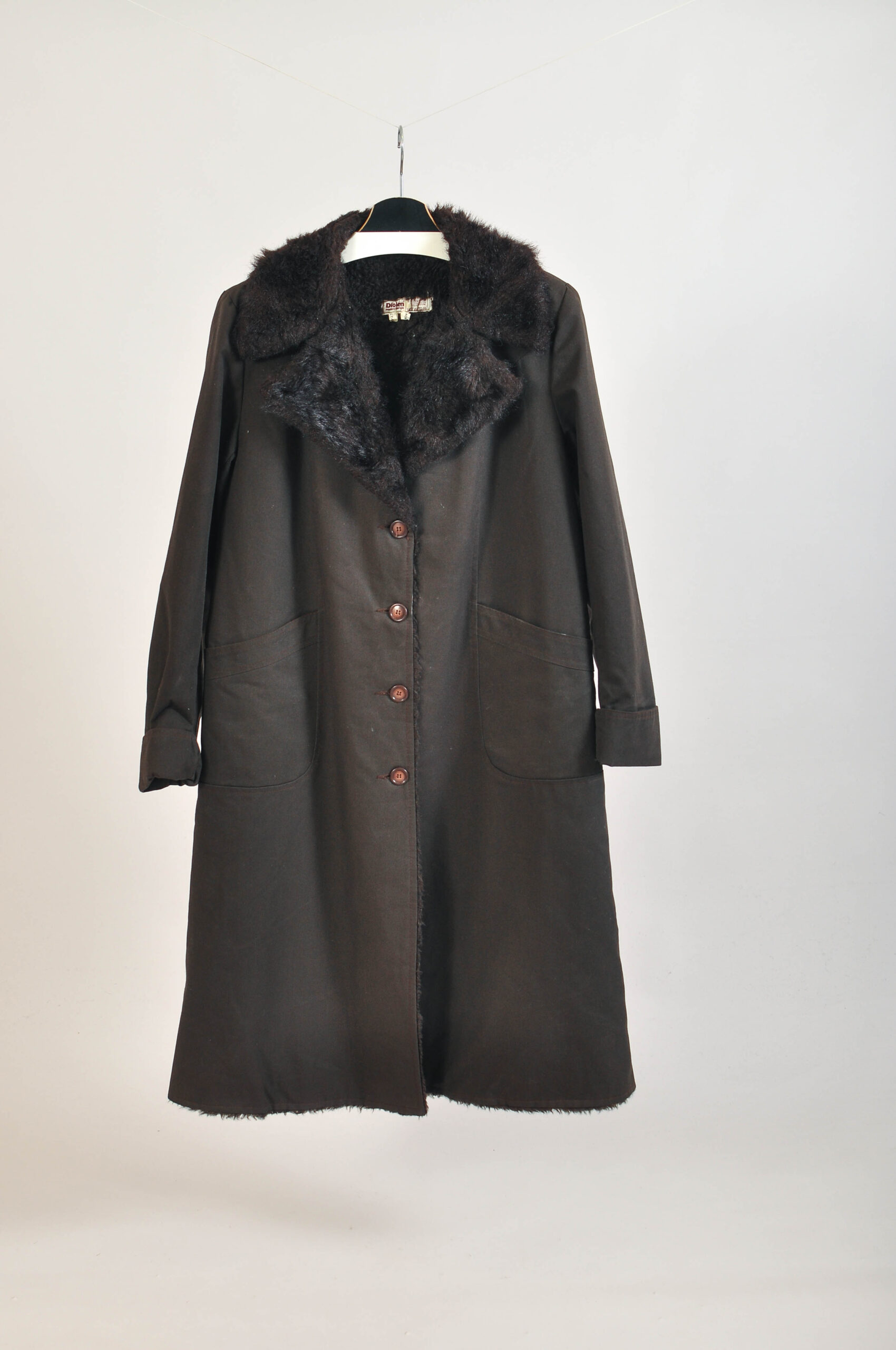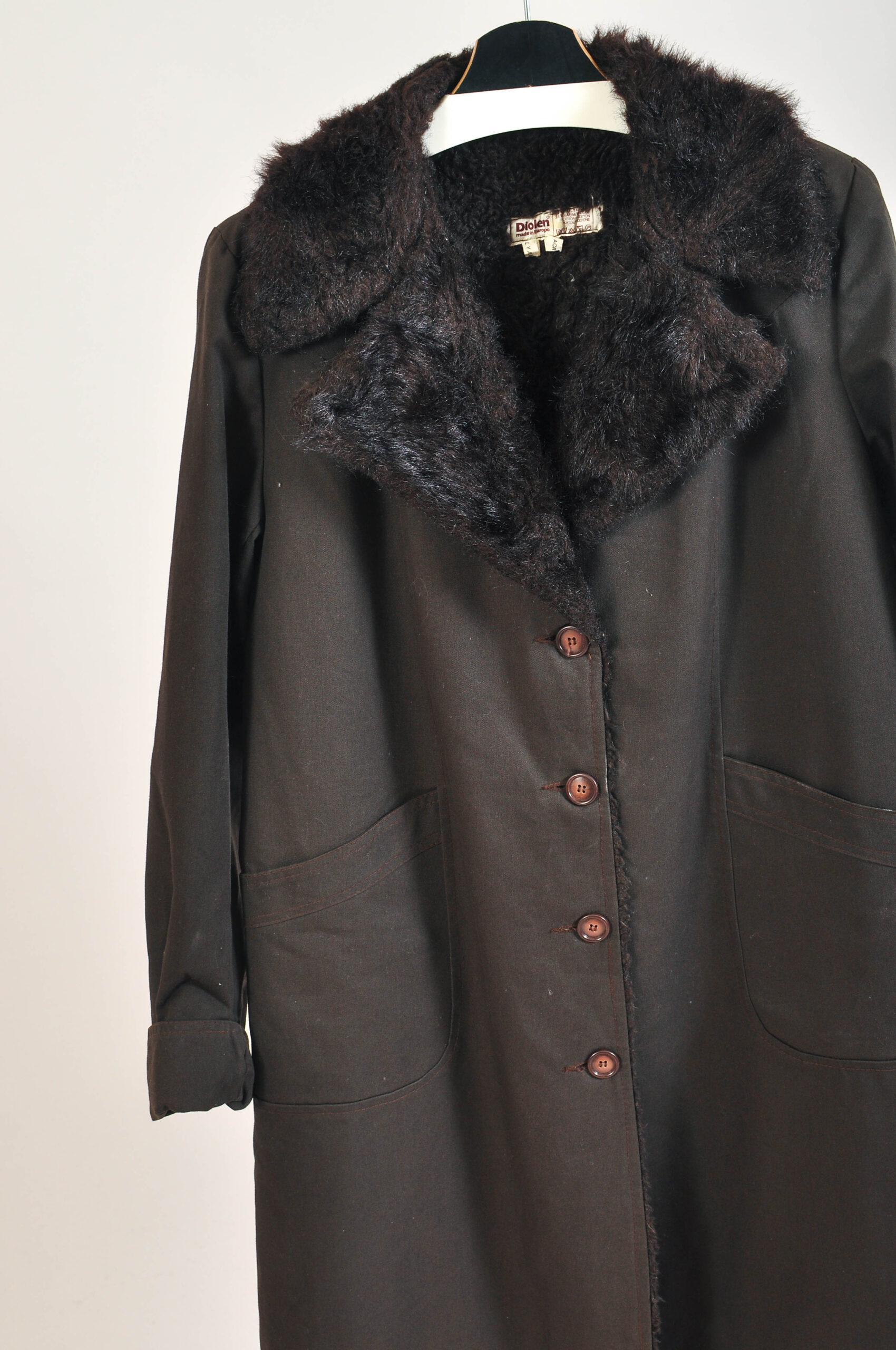 Authentic vintage 1970s dark brown maxi coat by Diolen, featuring a long, classic silhouette. A standout outerwear piece with timeless retro appeal. Shows natural signs of wear consistent with vintage condition. Please check measurements for accurate fit.