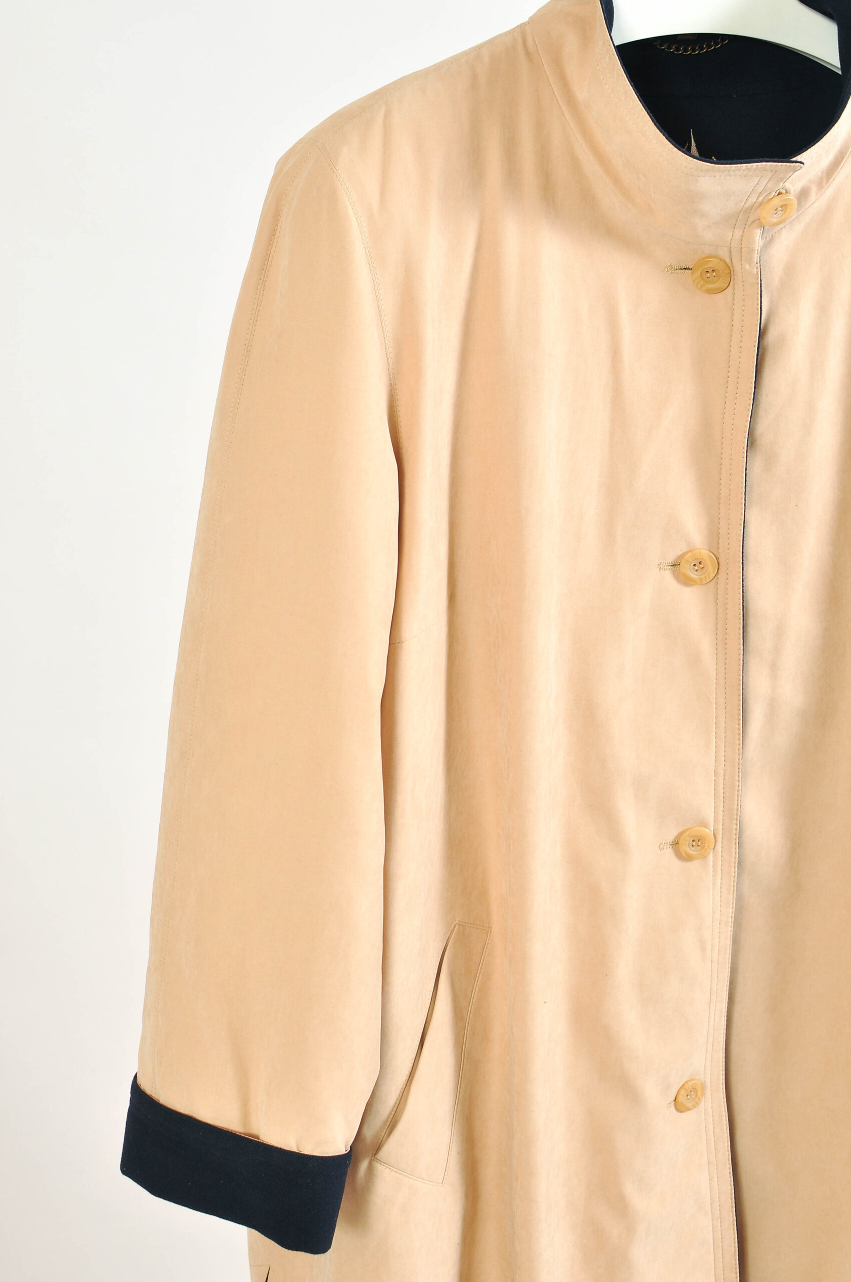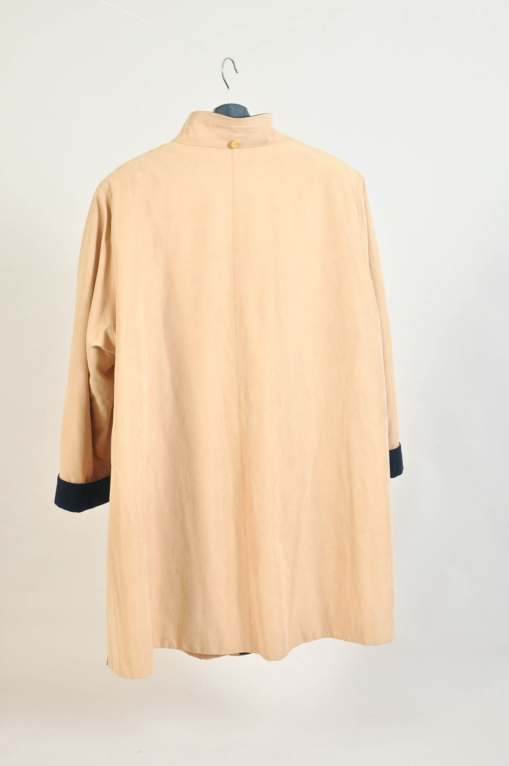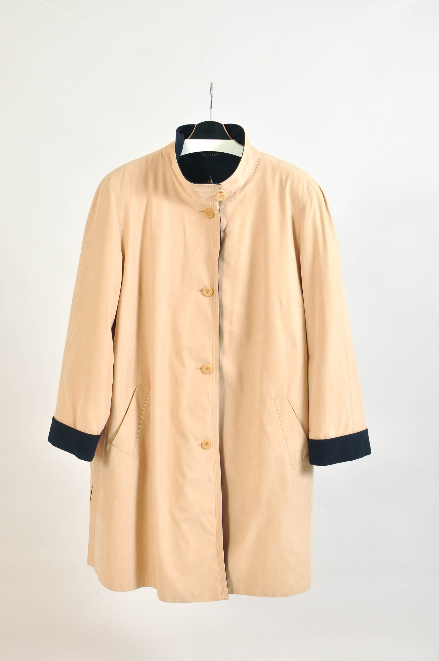 Vintage 80s funnel neck beige A-line coat by Winter Classics. Features a classic structured silhouette and warm neutral tone.