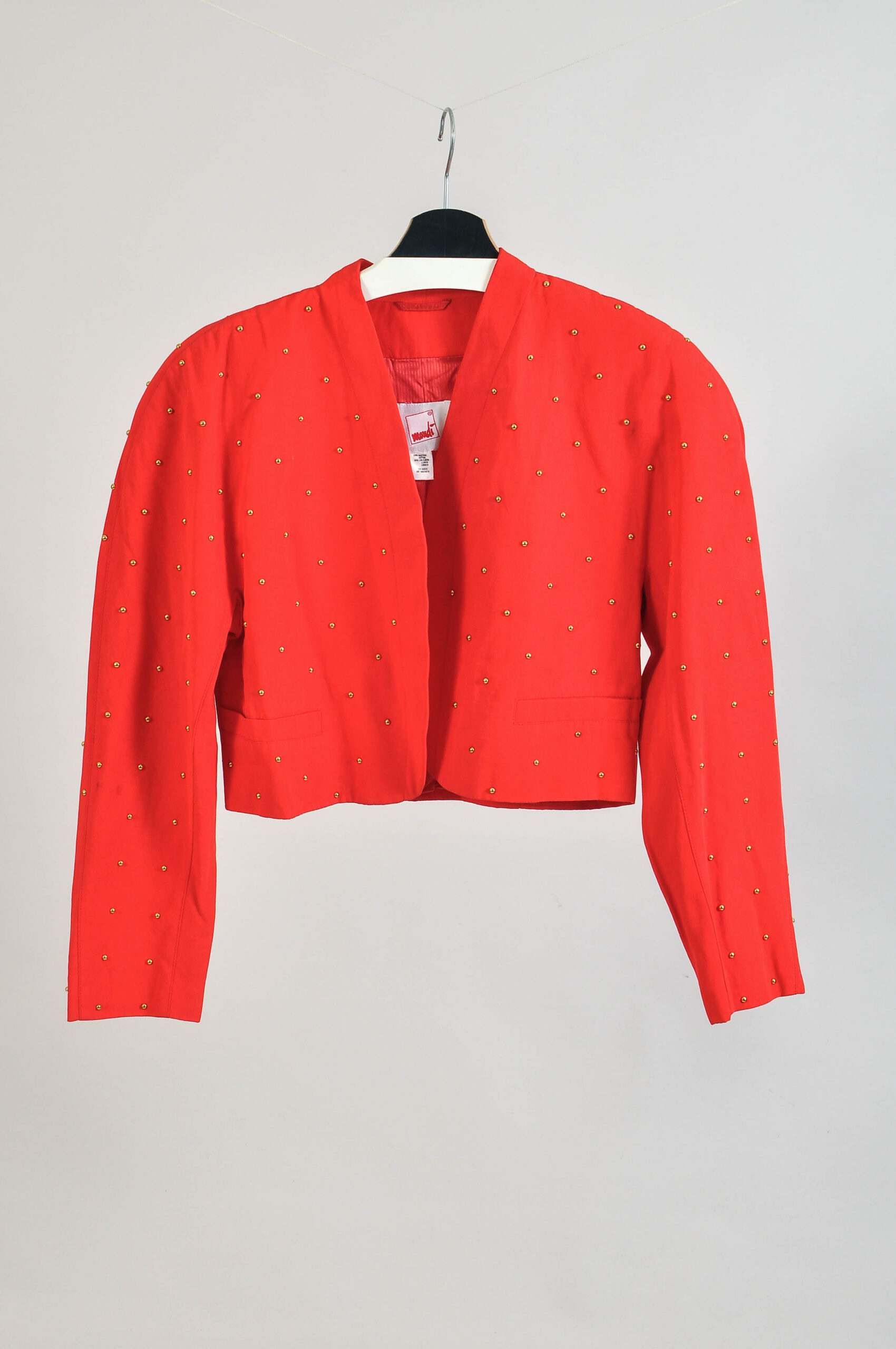Vintage 80s Mondi red bolero jacket with golden bead embellishments — a beautifully detailed statement piece from West Germany. Made from a high-quality linen-viscose blend, it captures timeless 80s elegance and craftsmanship.