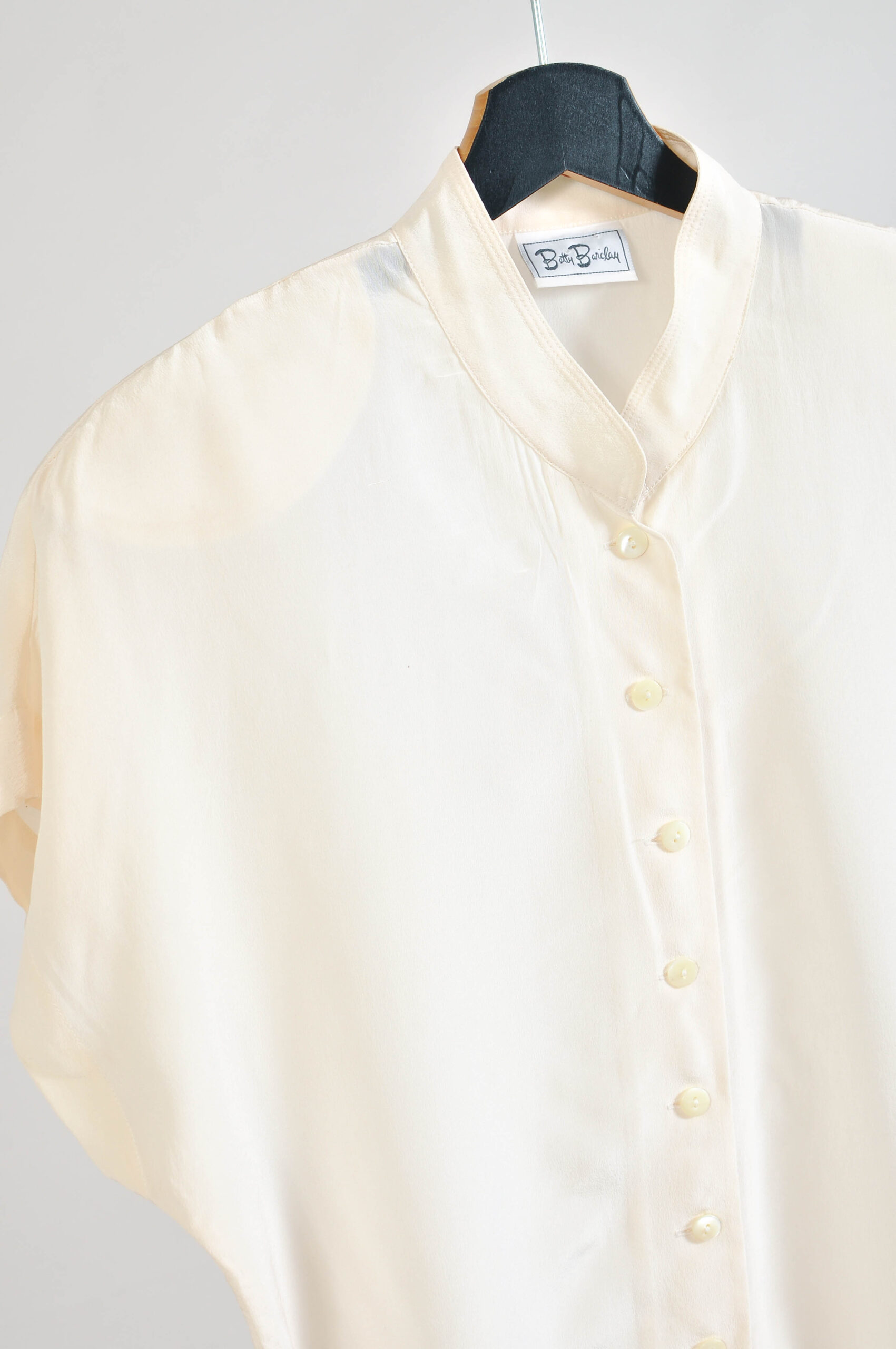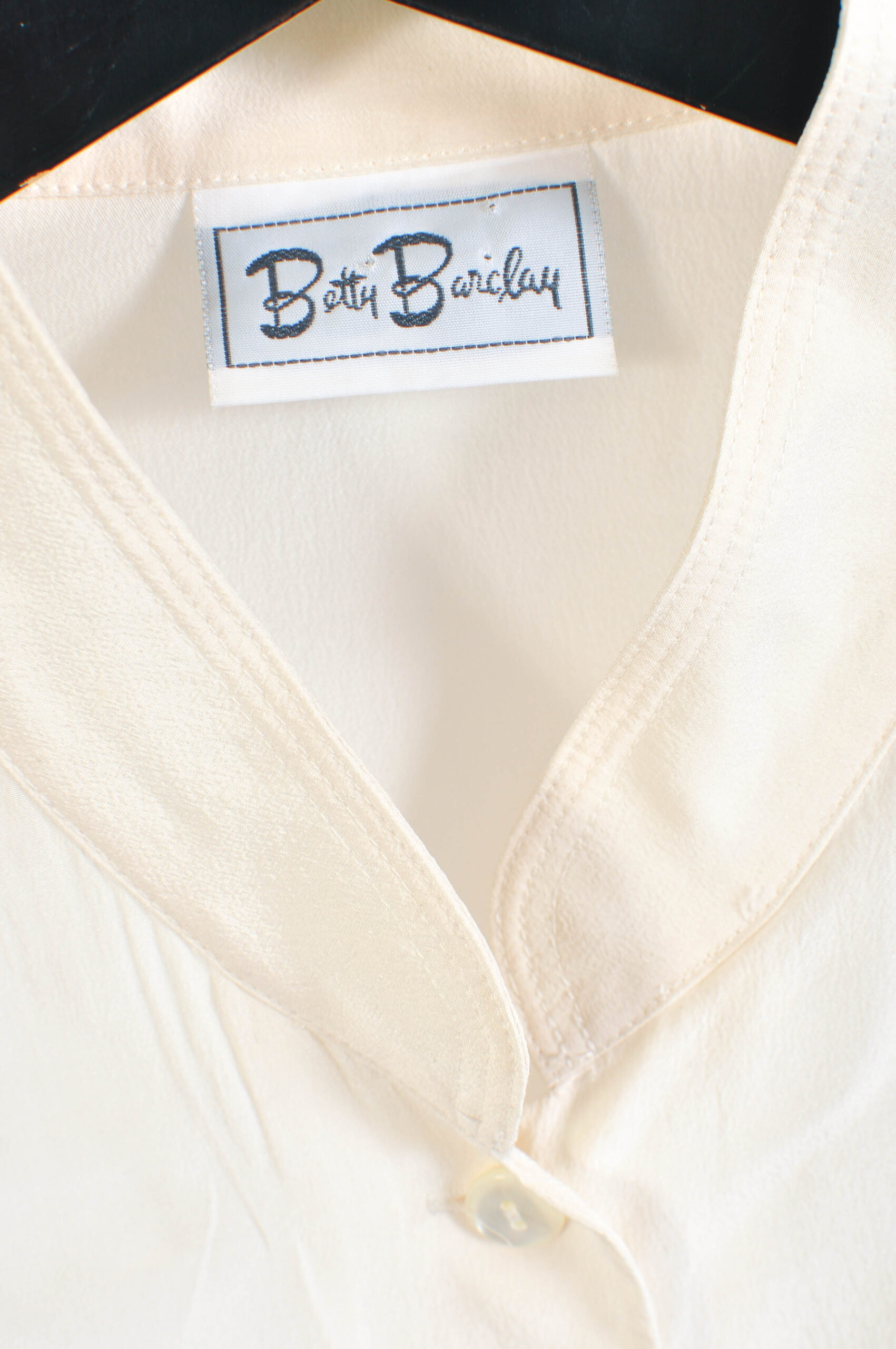 Step into timeless elegance with this vintage 90s Betty Barclay silk blouse. Crafted from 100% pure silk, this piece offers a luxurious feel and a classic silhouette. With a flattering fit that suits sizes S to M, it’s perfect for those who love effortless sophistication. The blouse is in very good condition with minor signs of natural vintage wear. A refined wardrobe essential for true vintage lovers.