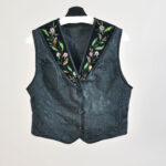 Authentic vintage 90s black embroidered vest featuring decorative stitching and suede leather details. A unique statement layering piece perfect for retro styling, boho-inspired outfits, or 90s streetwear looks.