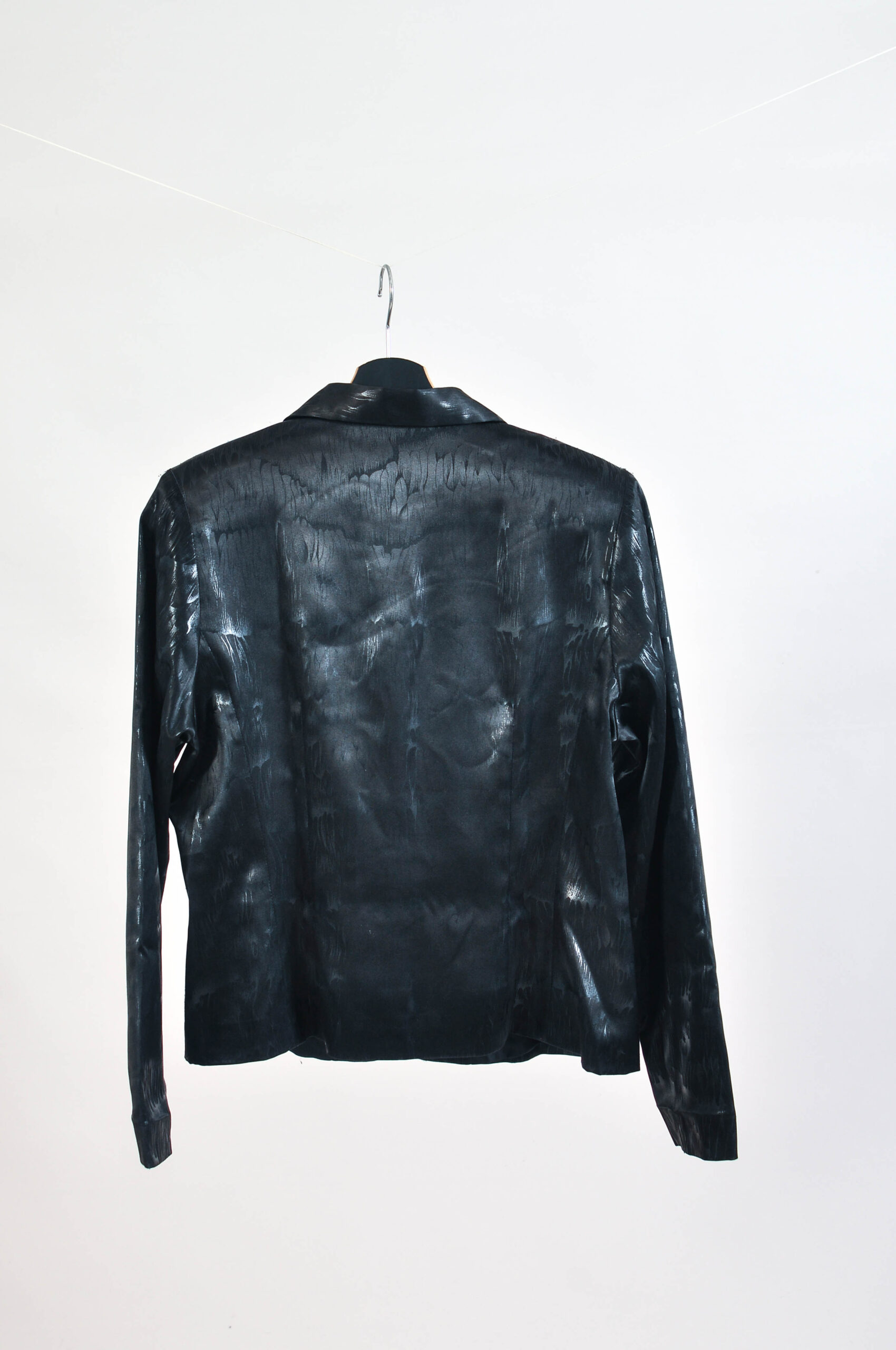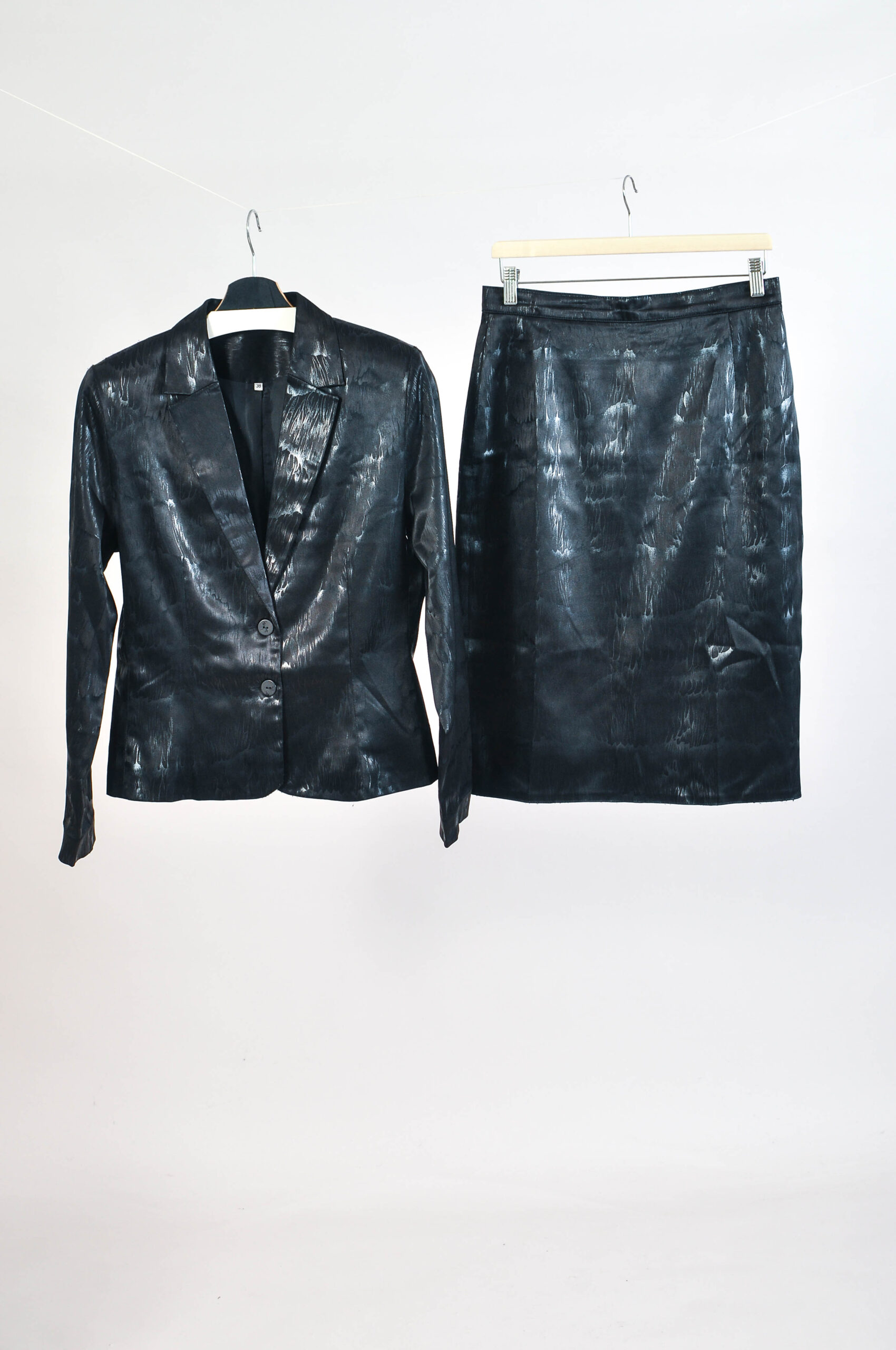 Elegant vintage 90s black skirt suit featuring a classic tailored blazer and matching skirt. A timeless set that offers a polished, sophisticated look perfect for both formal and smart-casual occasions.