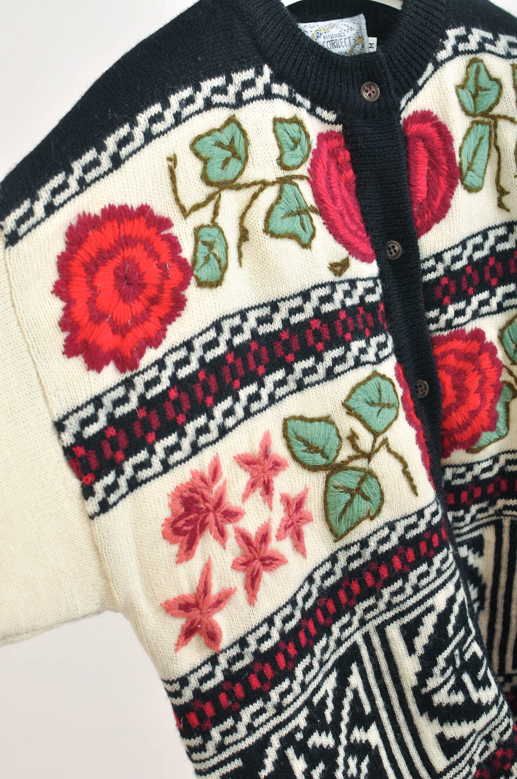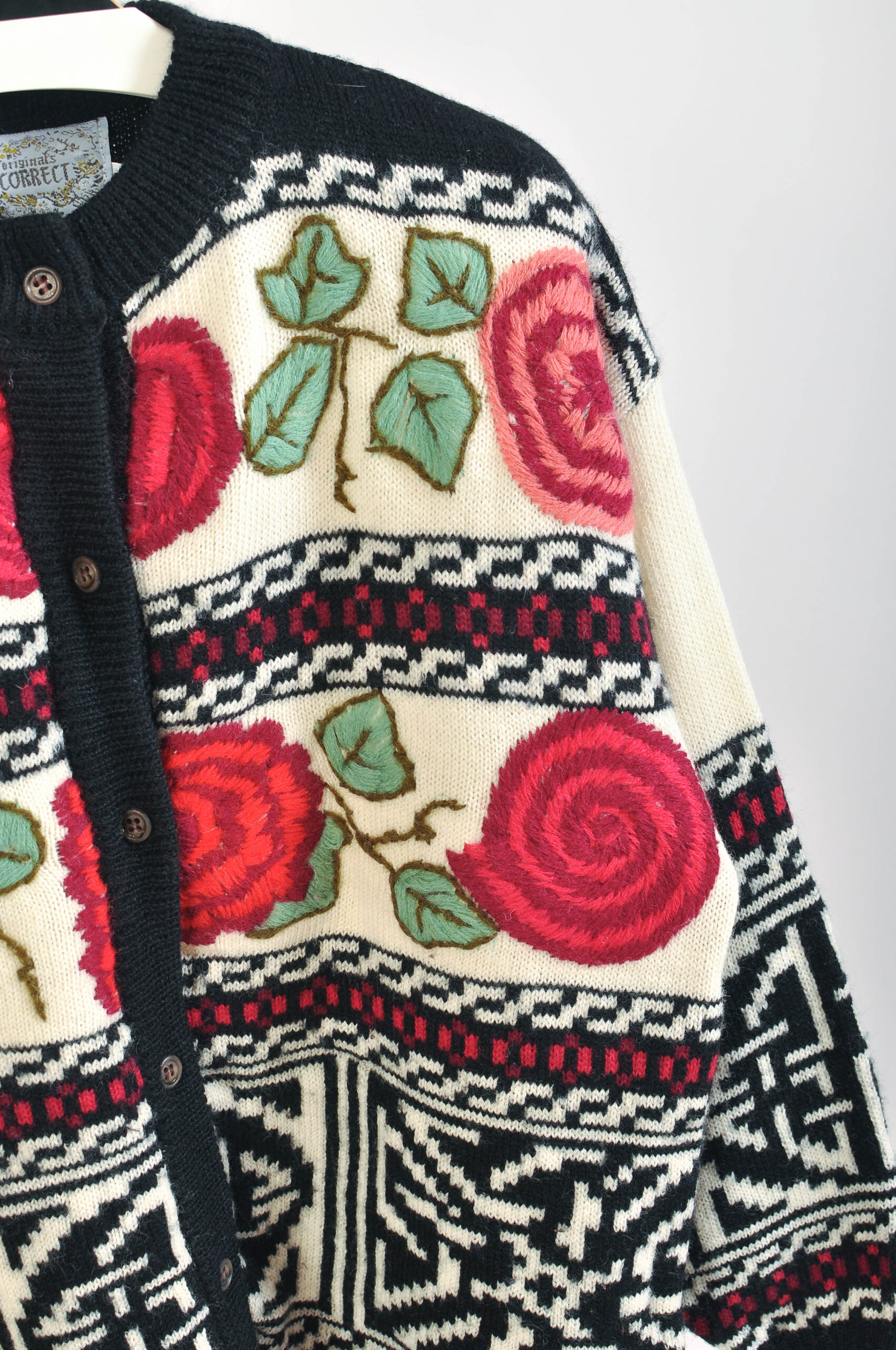 Vintage 90s oversized warm cardigan with beautiful flower embroidery. A cozy, charming knit featuring delicate floral detailing across the front—perfect for adding a soft, nostalgic touch to any outfit.
