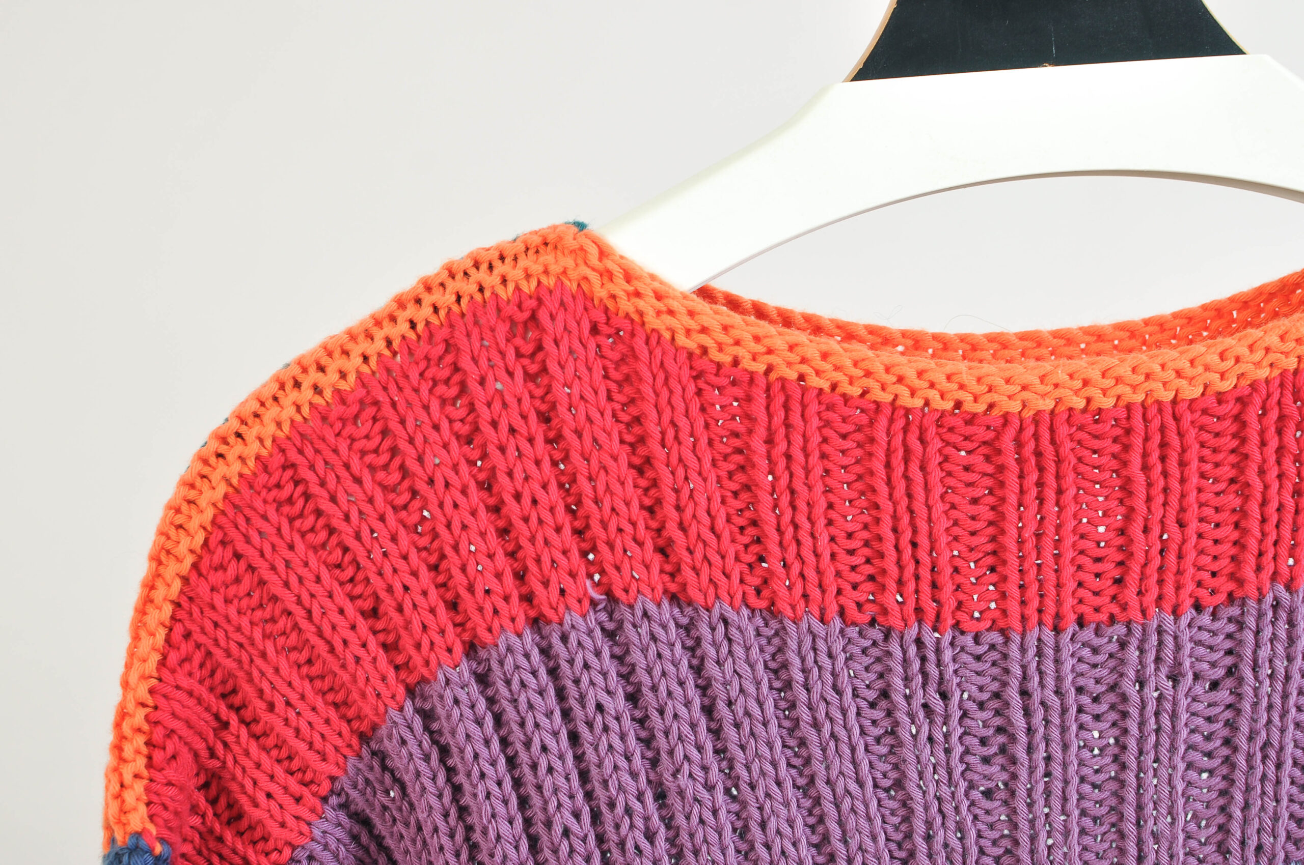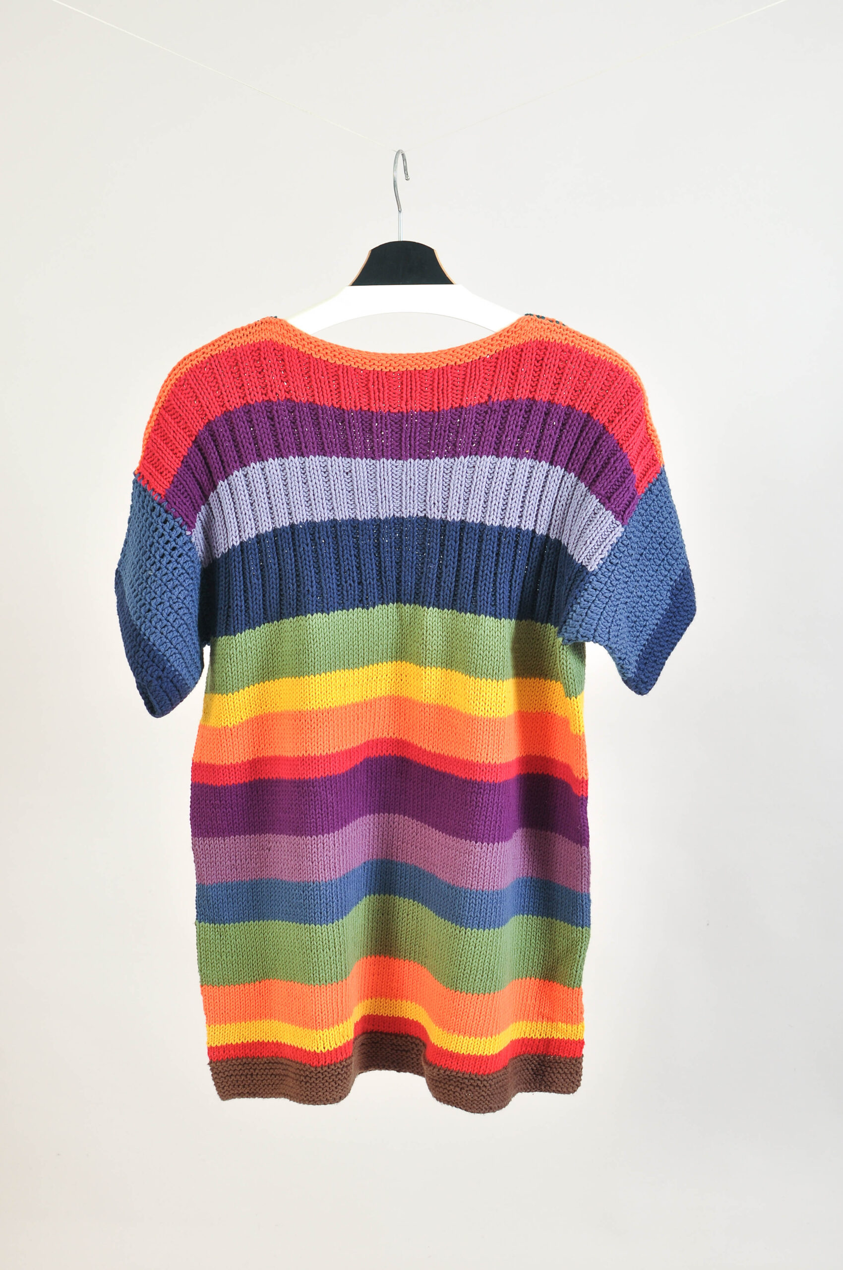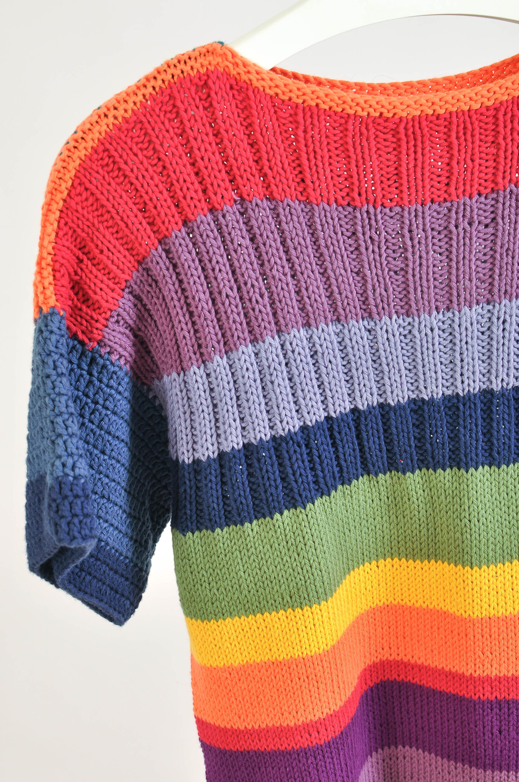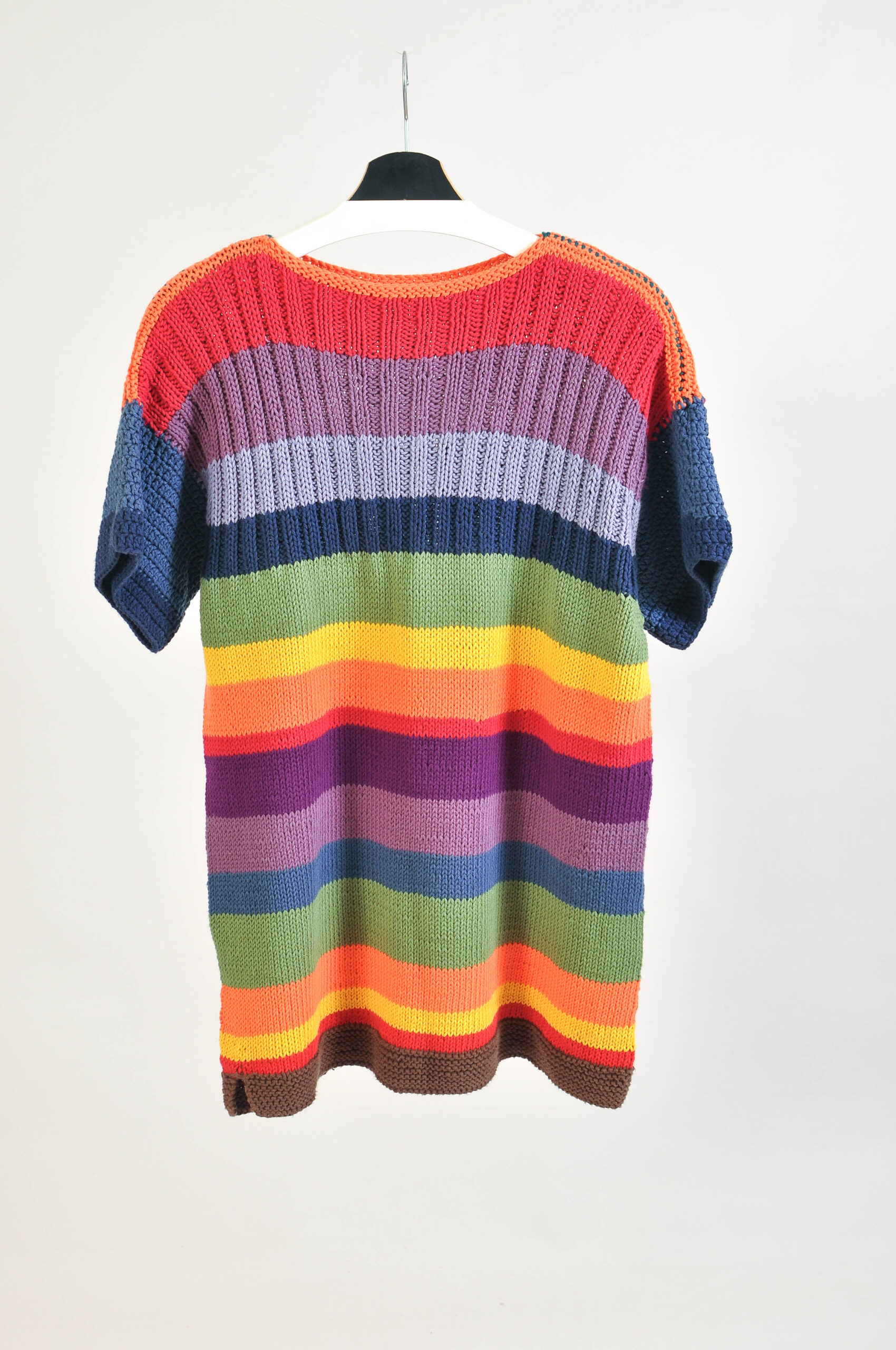 Add a touch of handmade charm to your wardrobe with this Vintage 90s Hand Knit Striped Cotton Top. A timeless piece crafted from soft cotton yarn, designed with bold stripes for that effortlessly retro vibe. Can be styled either as a regular fit or oversized, depending on your look.