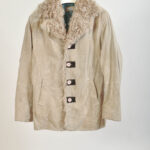 There is no size written, but it best fits L–XL sizes. The coat shows natural signs of wear, consistent with authentic vintage leather garments.