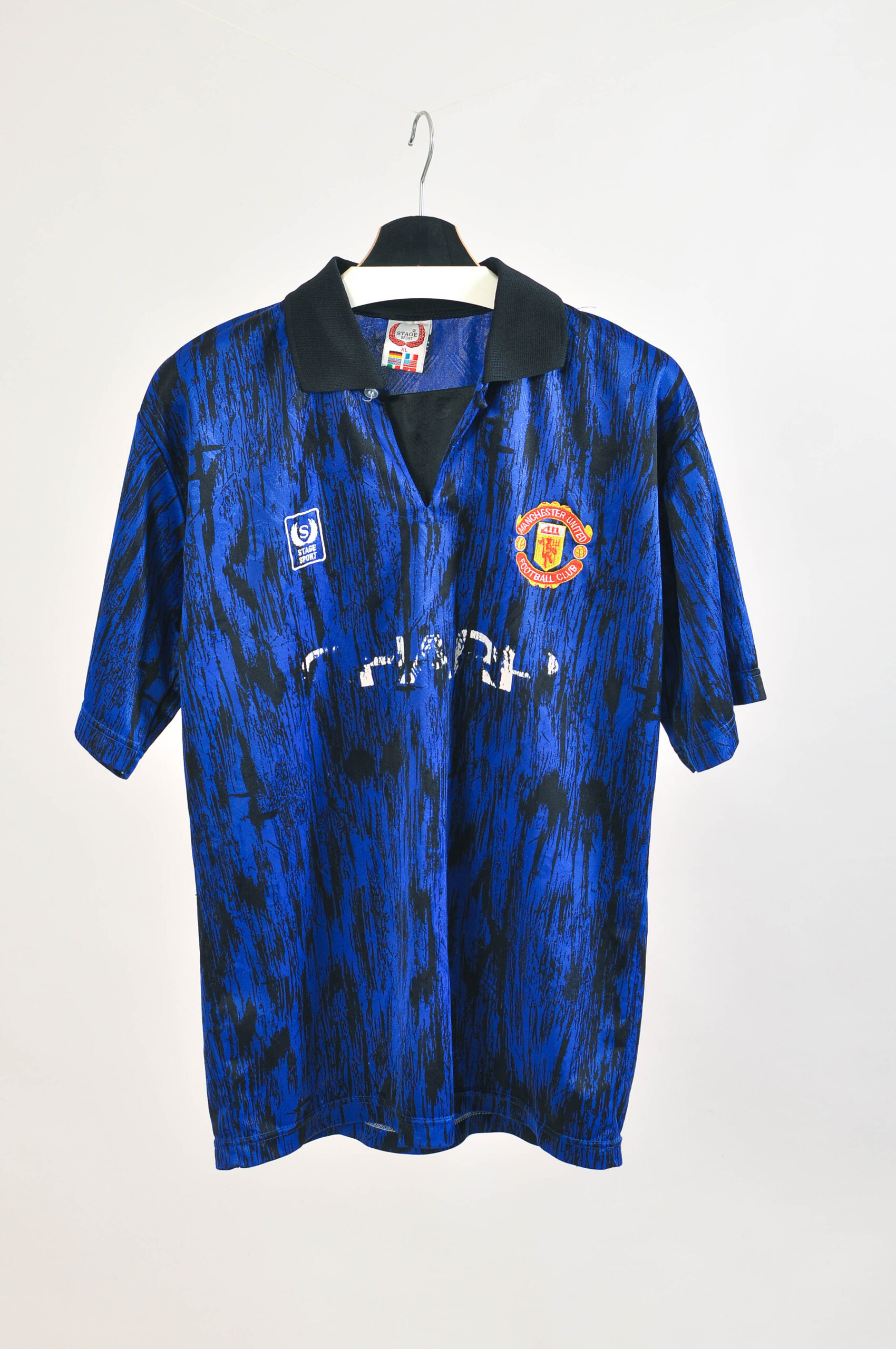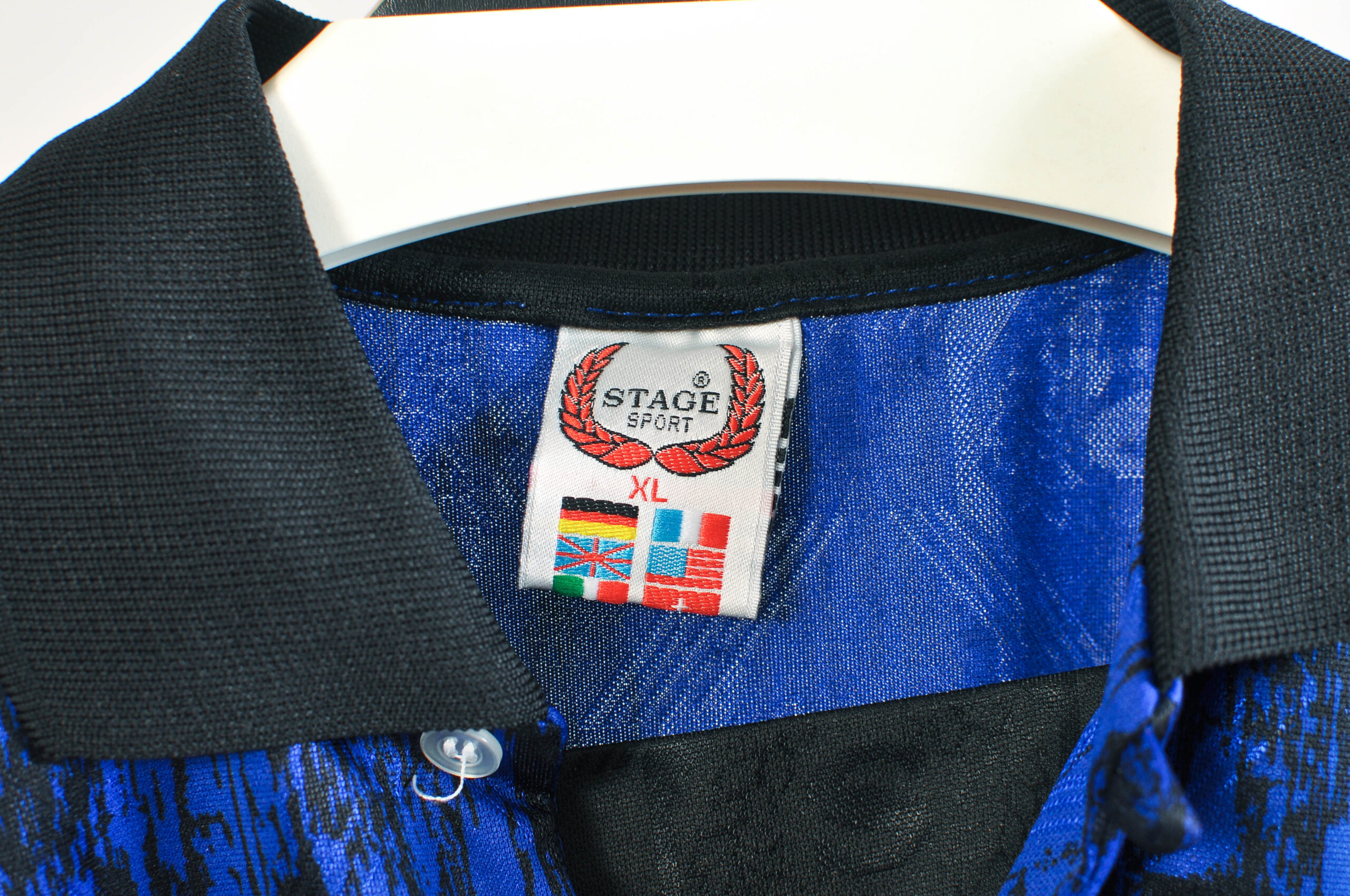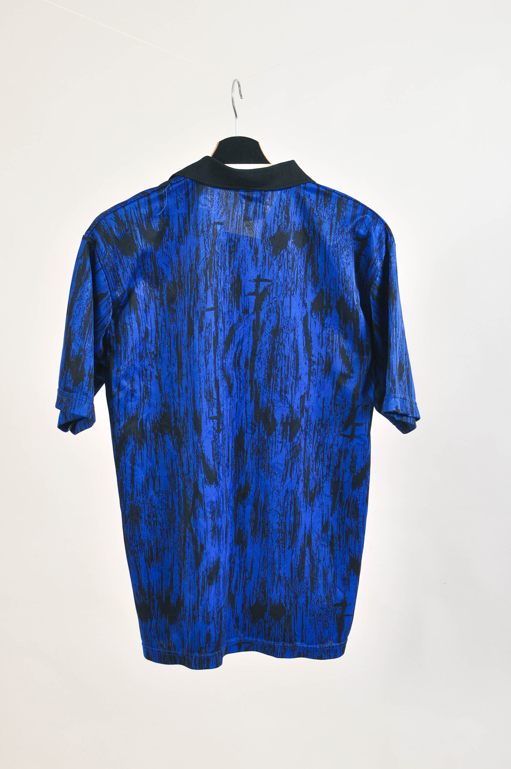 Vintage 90s Manchester United fan shirt by Stage Sport in striking blue with black pattern. This is a rare supporter’s jersey, not the official Umbro version, but an authentic fan-made piece from the early 90s that captures the spirit of football culture from that era.