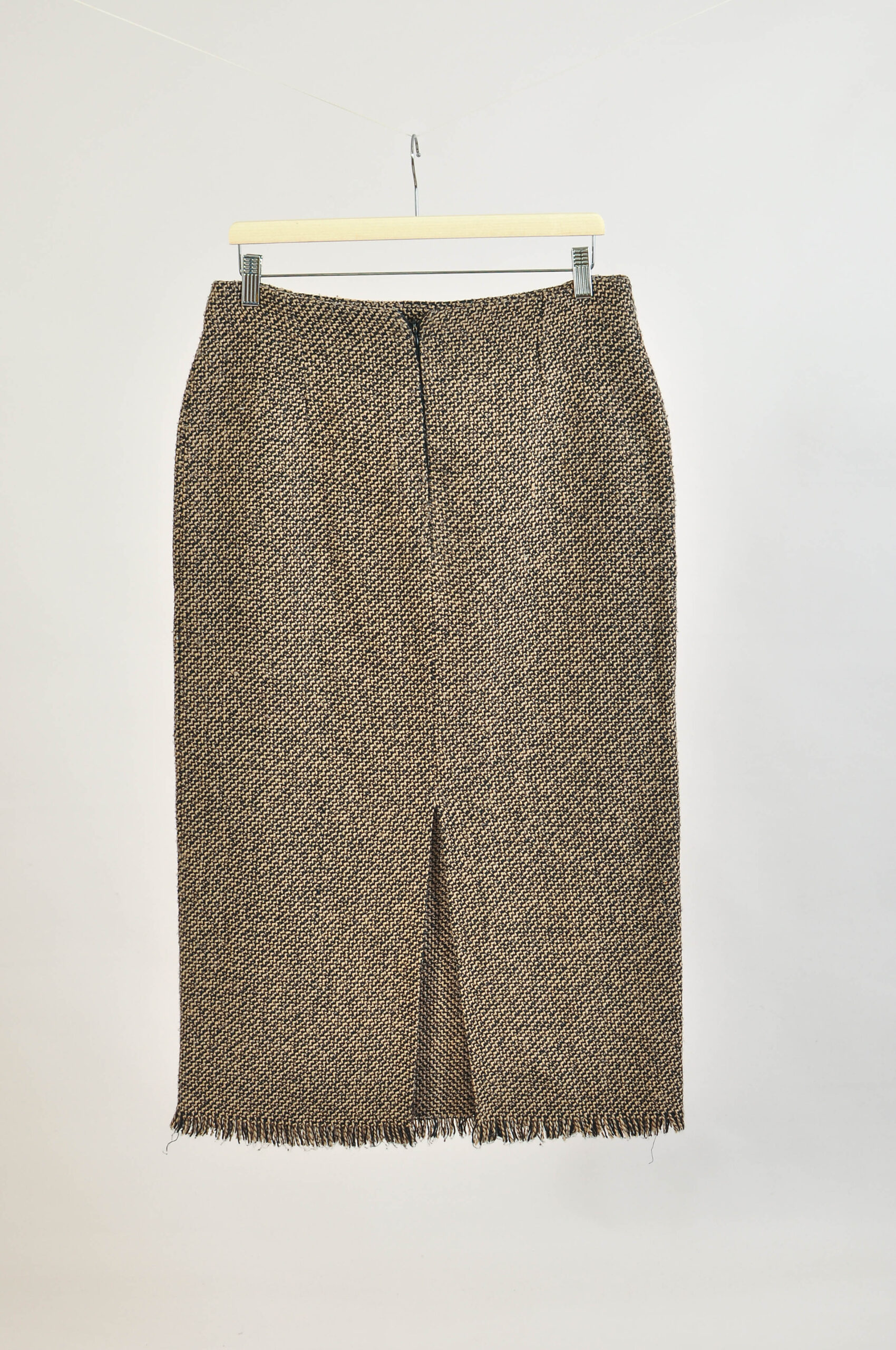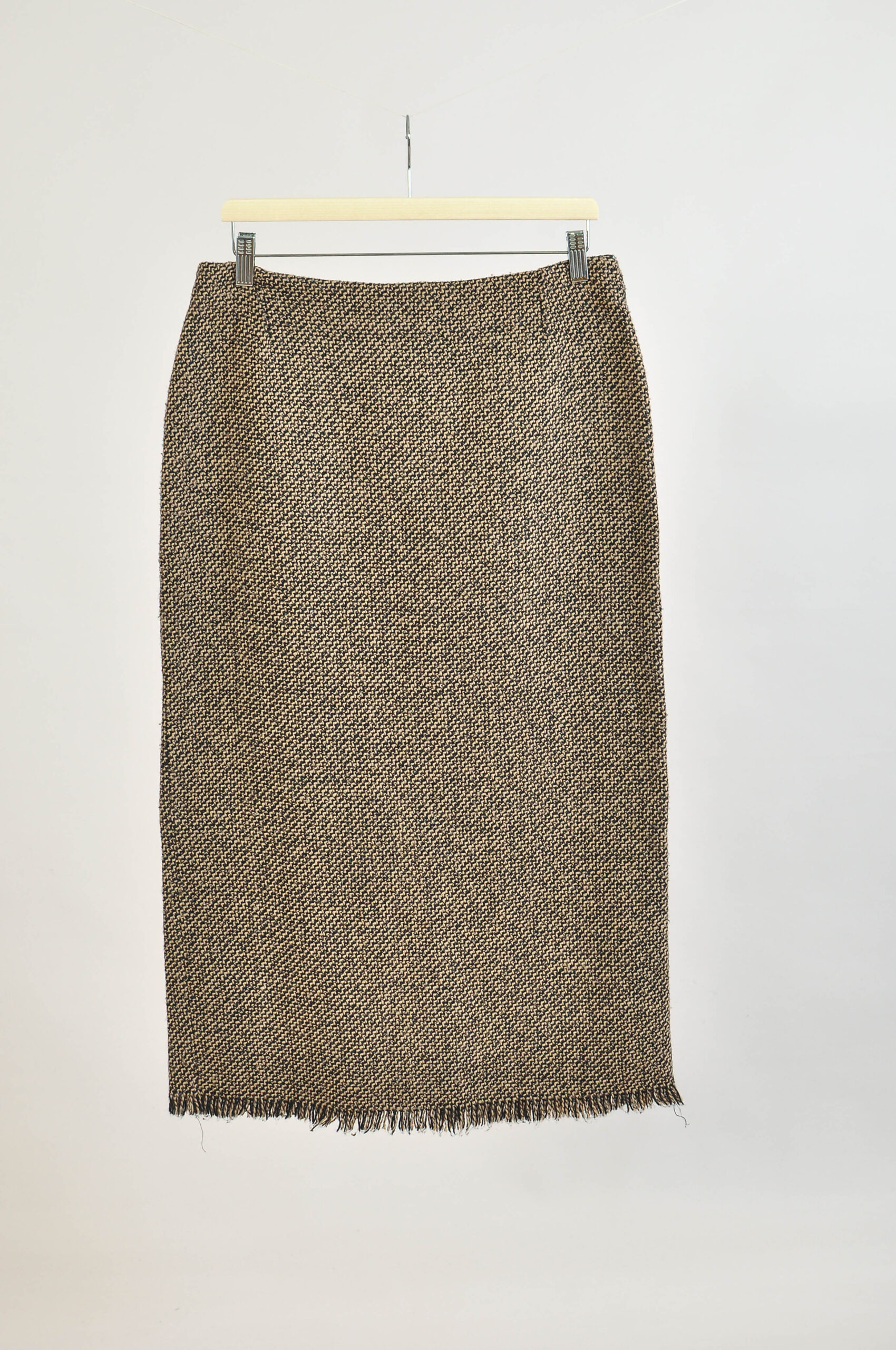 Vintage 90s tweed midi skirt in a classic brown tone — a timeless and elegant piece perfect for autumn and winter styling. Made from a soft wool blend fabric, this skirt offers both comfort and sophistication.