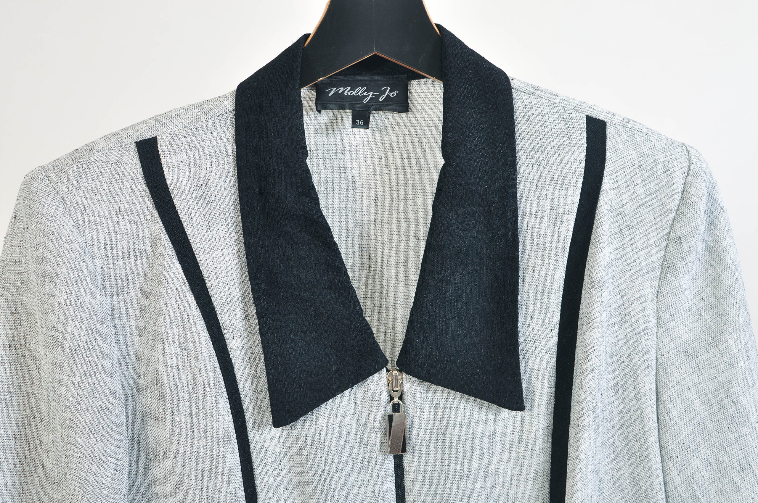 This vintage 1990s zip-up blouse by Molly-Jo is a sleek and stylish piece, perfect for adding a touch of retro elegance to your wardrobe. Crafted in a versatile grey shade, it features a zip-up front for a modern yet timeless look. In very good condition, with only natural signs of wear, as expected with all vintage clothing.