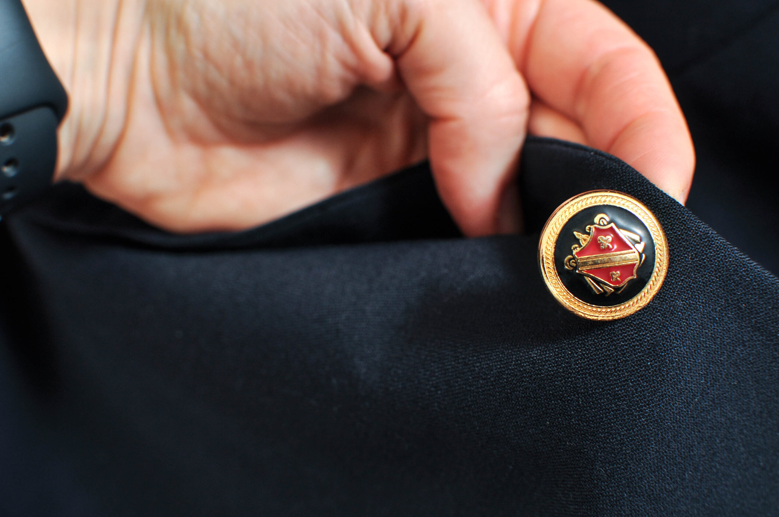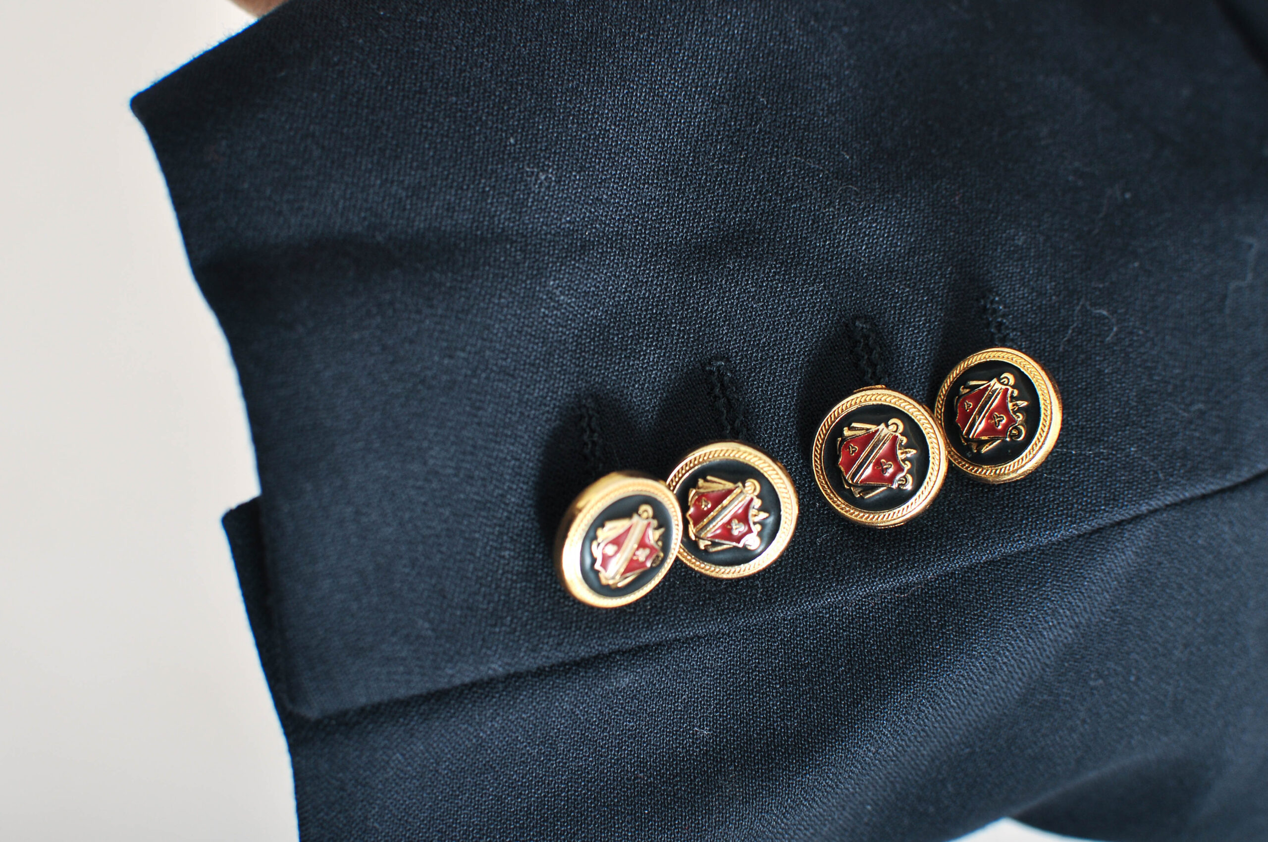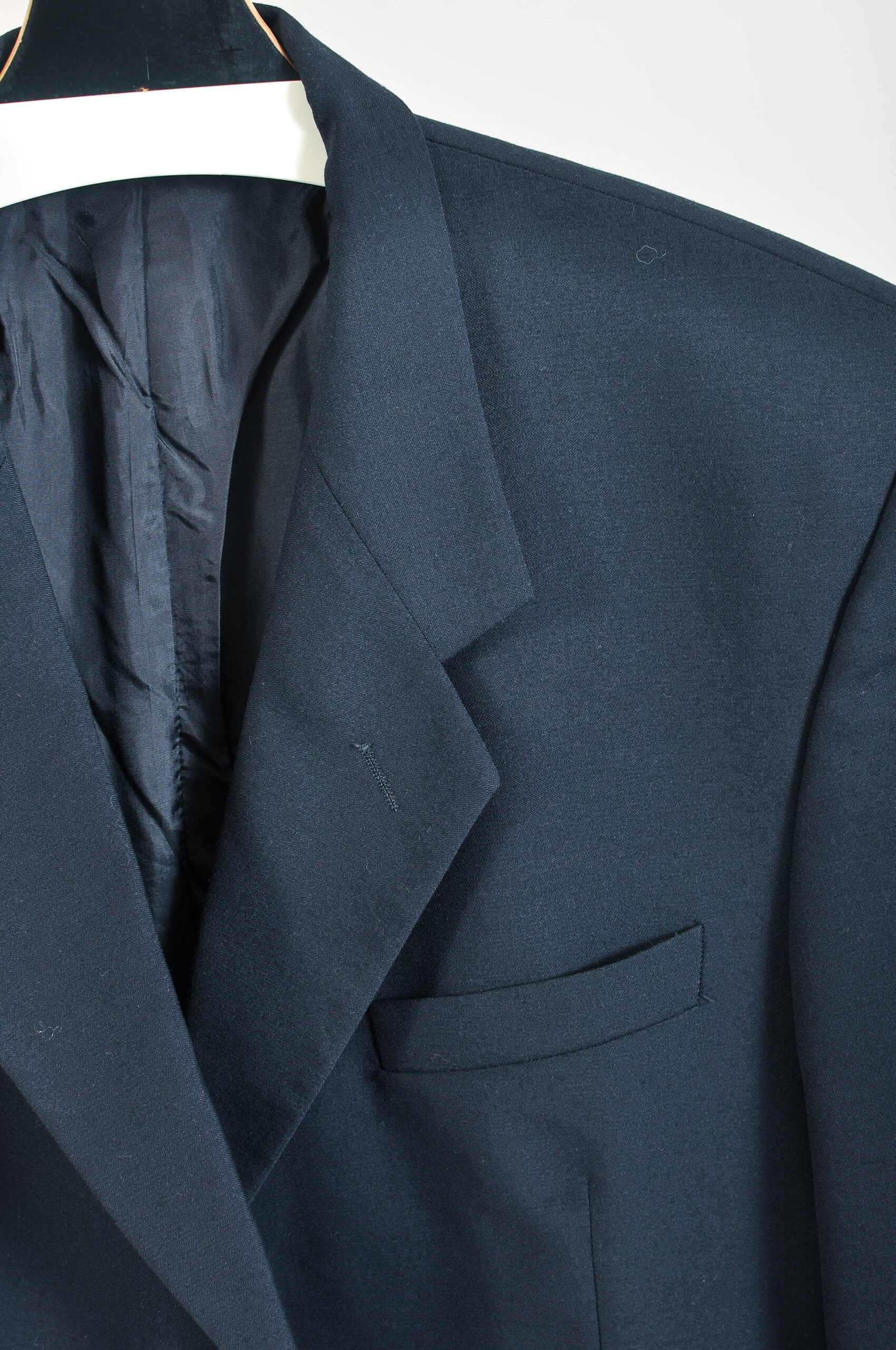 Authentic vintage 1990s navy blazer jacket by Frislid, finished with classic gold buttons. Made from a durable wool-blend fabric, offering a timeless tailored look. Shows natural signs of wear consistent with vintage condition. Please check measurements for accurate fit.