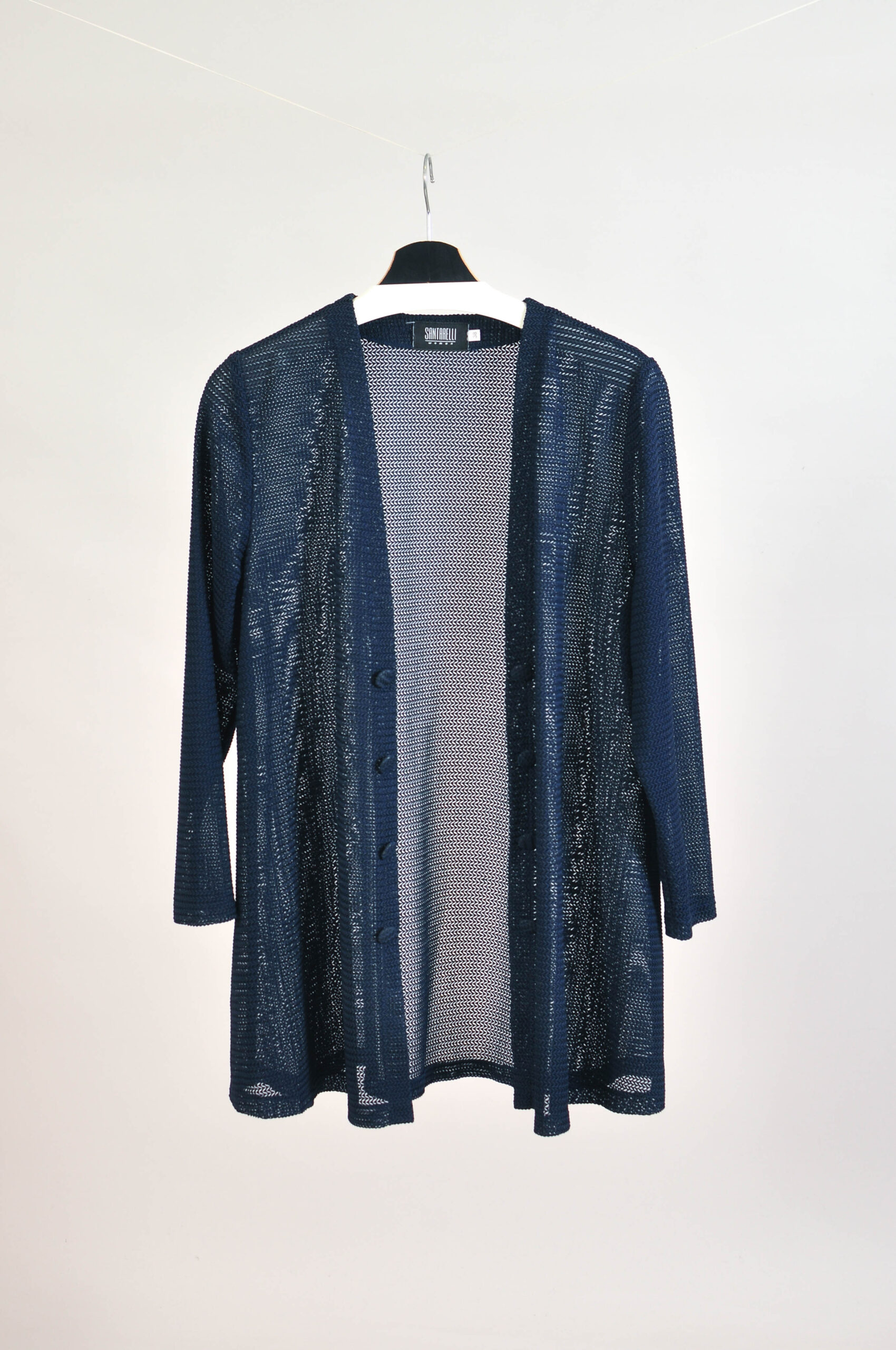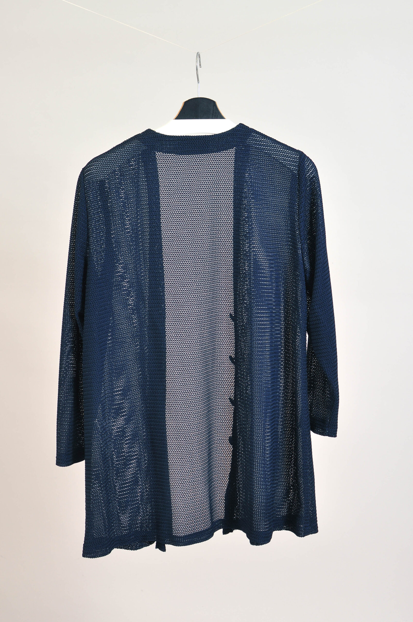 Elegant vintage 90s open front navy kimono by Santarelli featuring a relaxed, flowing silhouette and minimalist design. A versatile layering piece that adds effortless sophistication to any outfit.