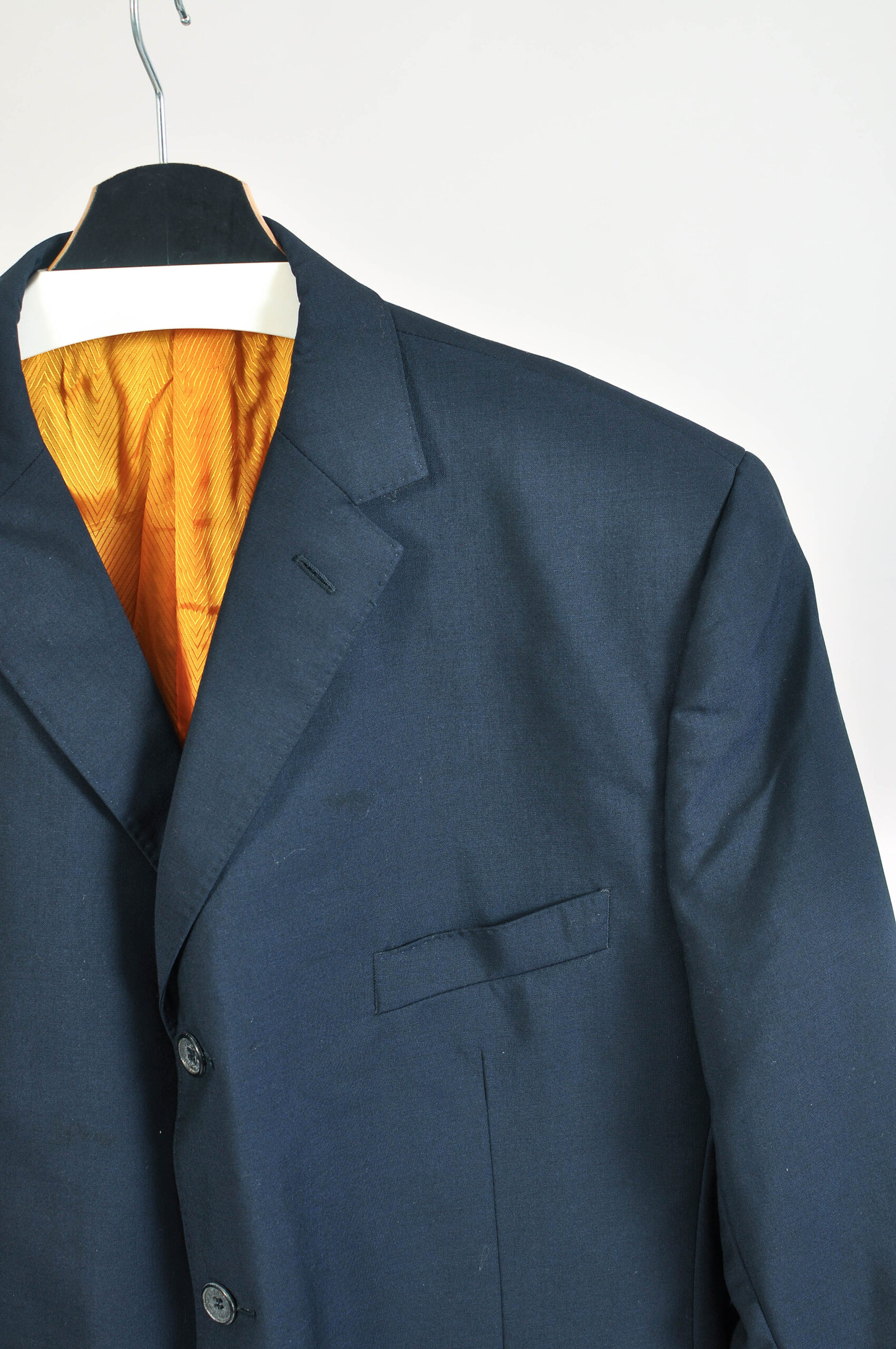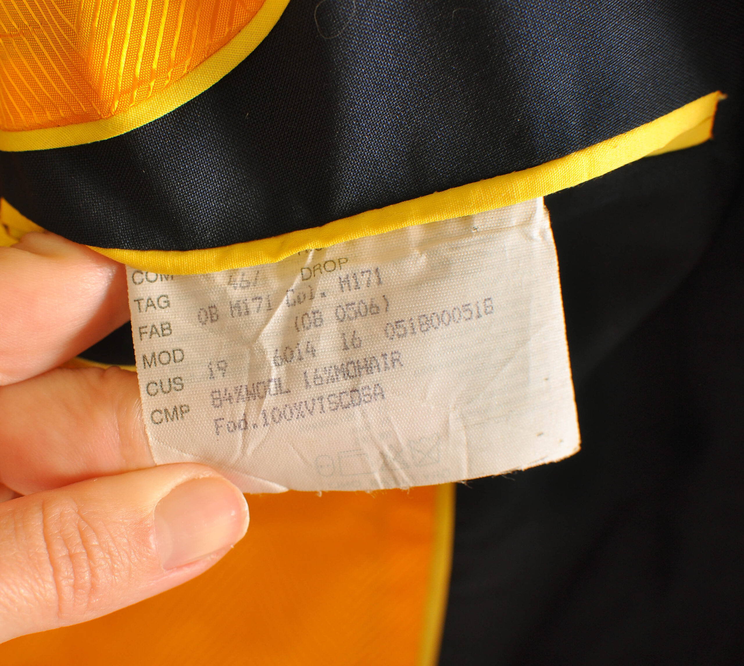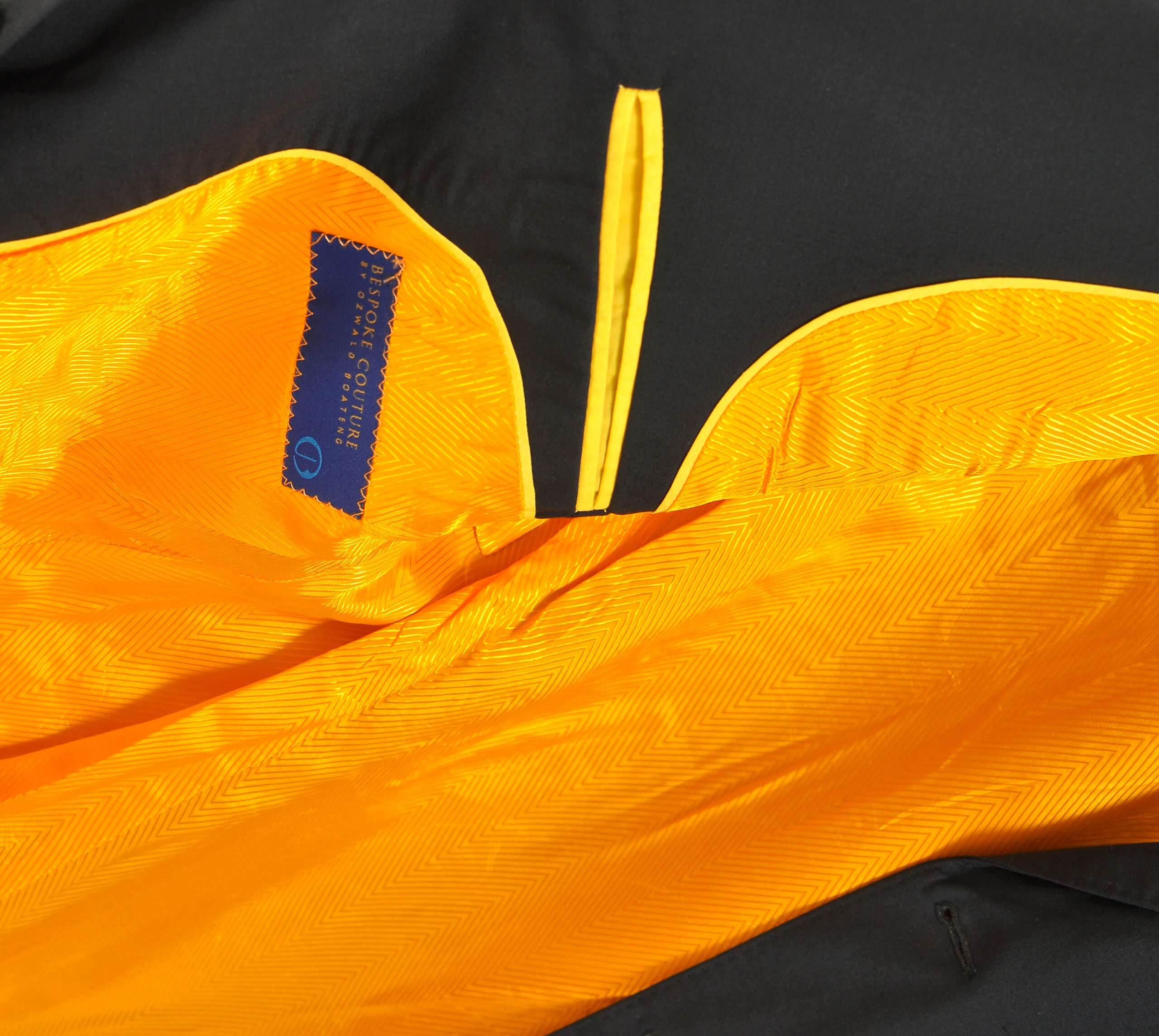 A vibrant yellow lining with a zigzag pattern (100% viscose), a striking signature element of his 90s bespoke work.
