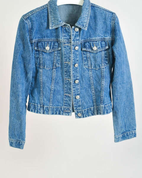 A staple vintage denim jacket that pairs effortlessly with jeans, skirts, or casual streetwear looks.