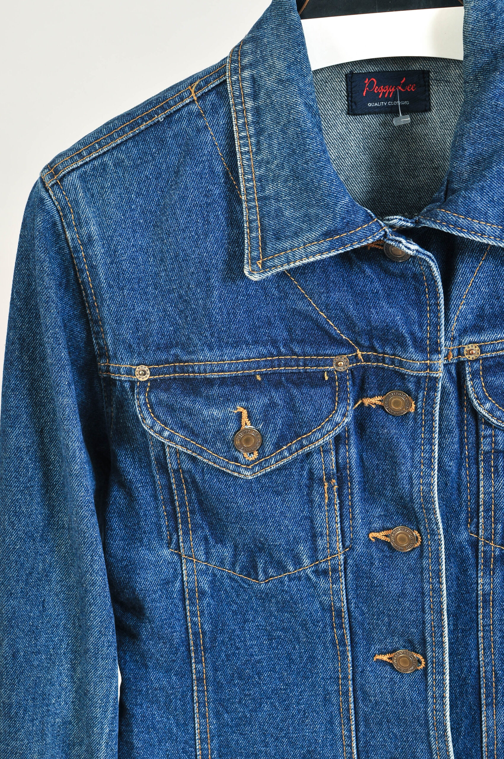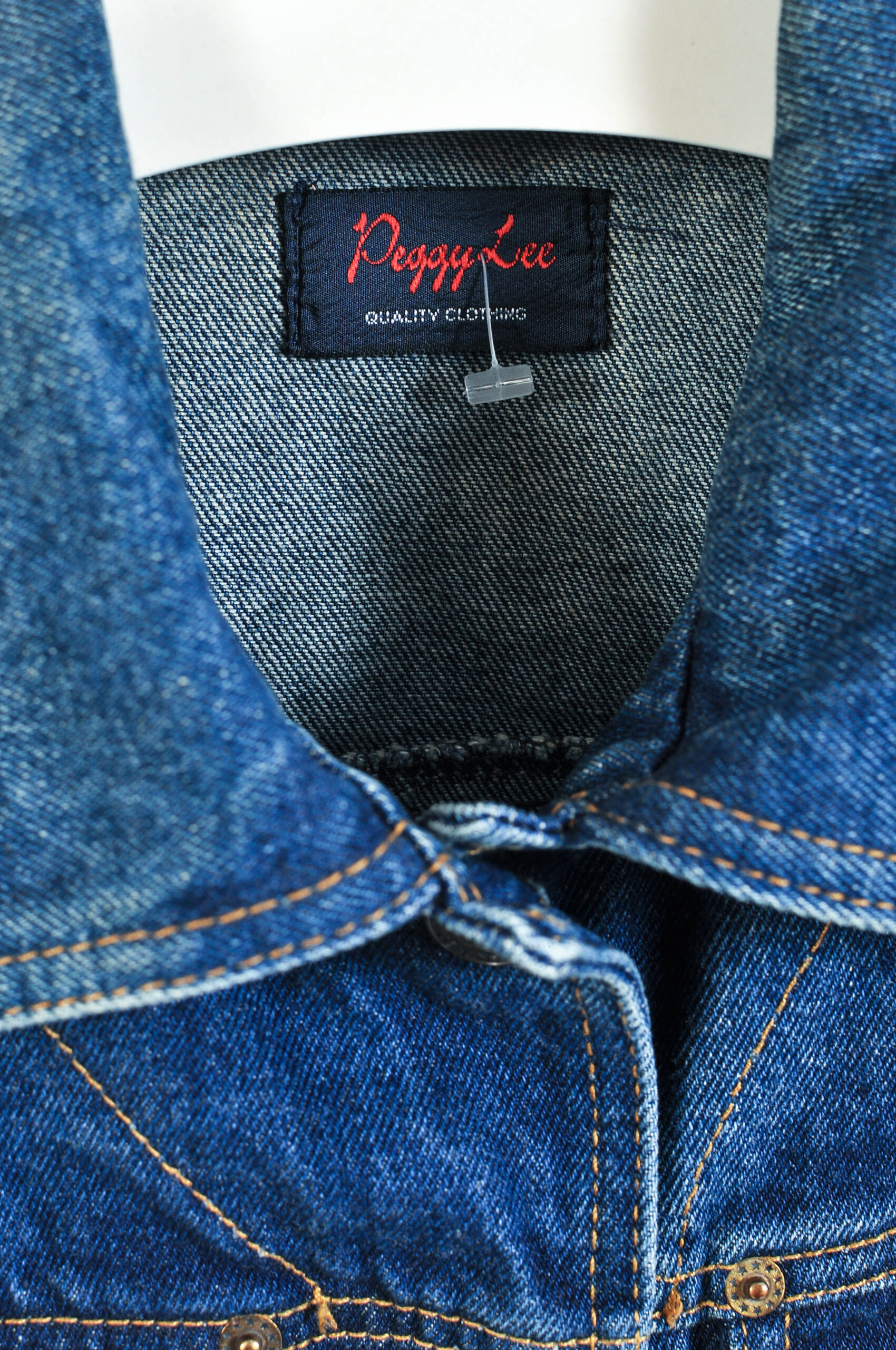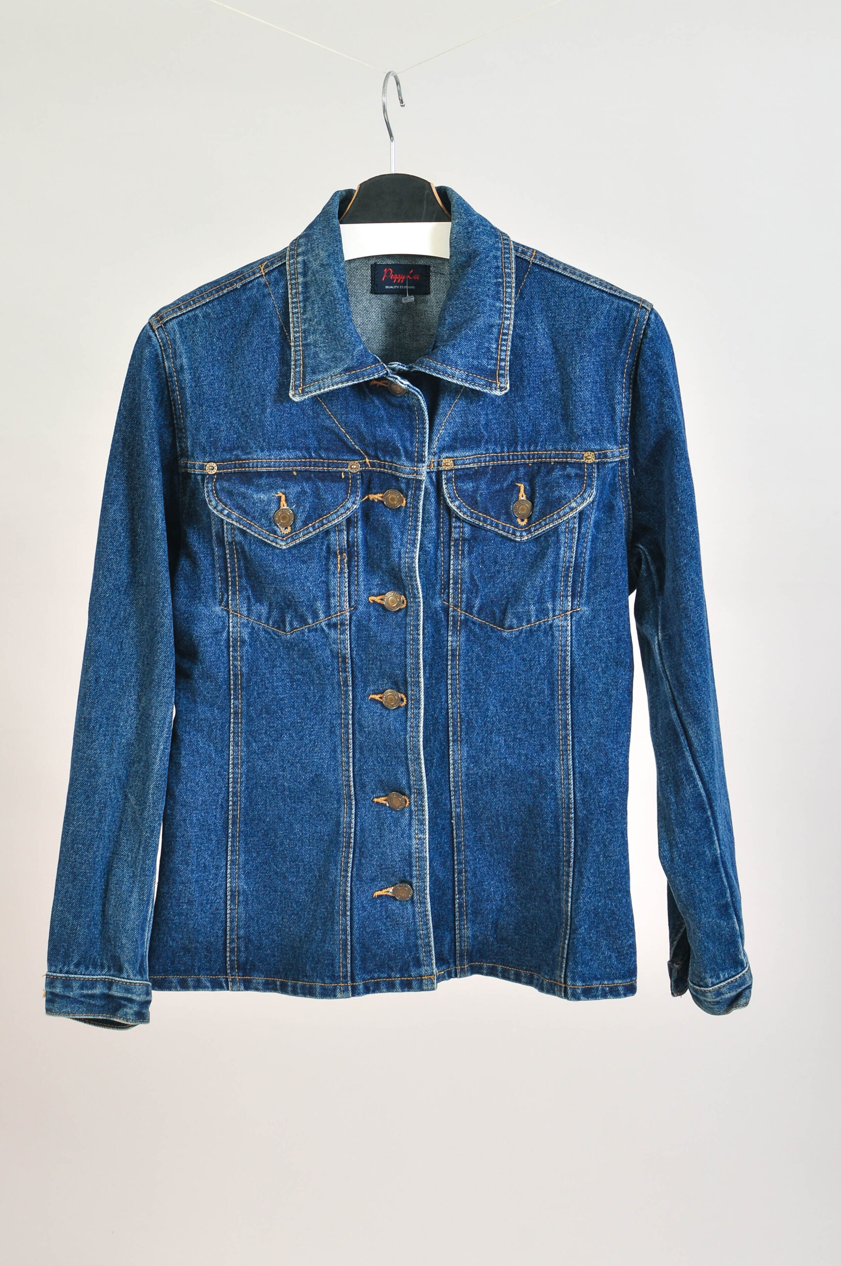 Classic vintage 90s dark denim jacket by Peggy Lee featuring a timeless structured design and durable denim fabric. This versatile piece reflects authentic 1990s style and is perfect for everyday wear or layering with retro outfits.