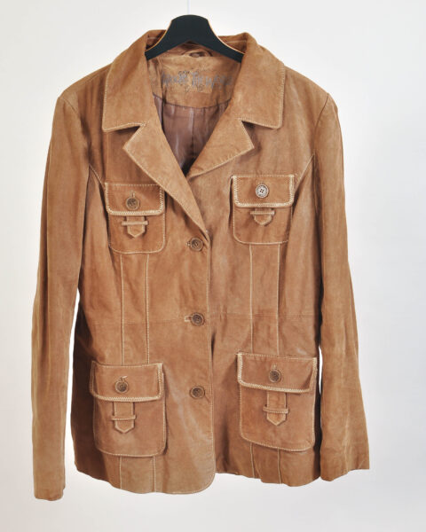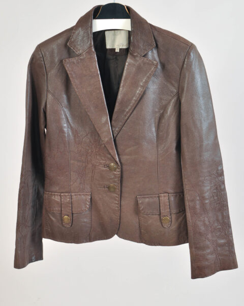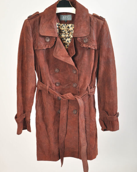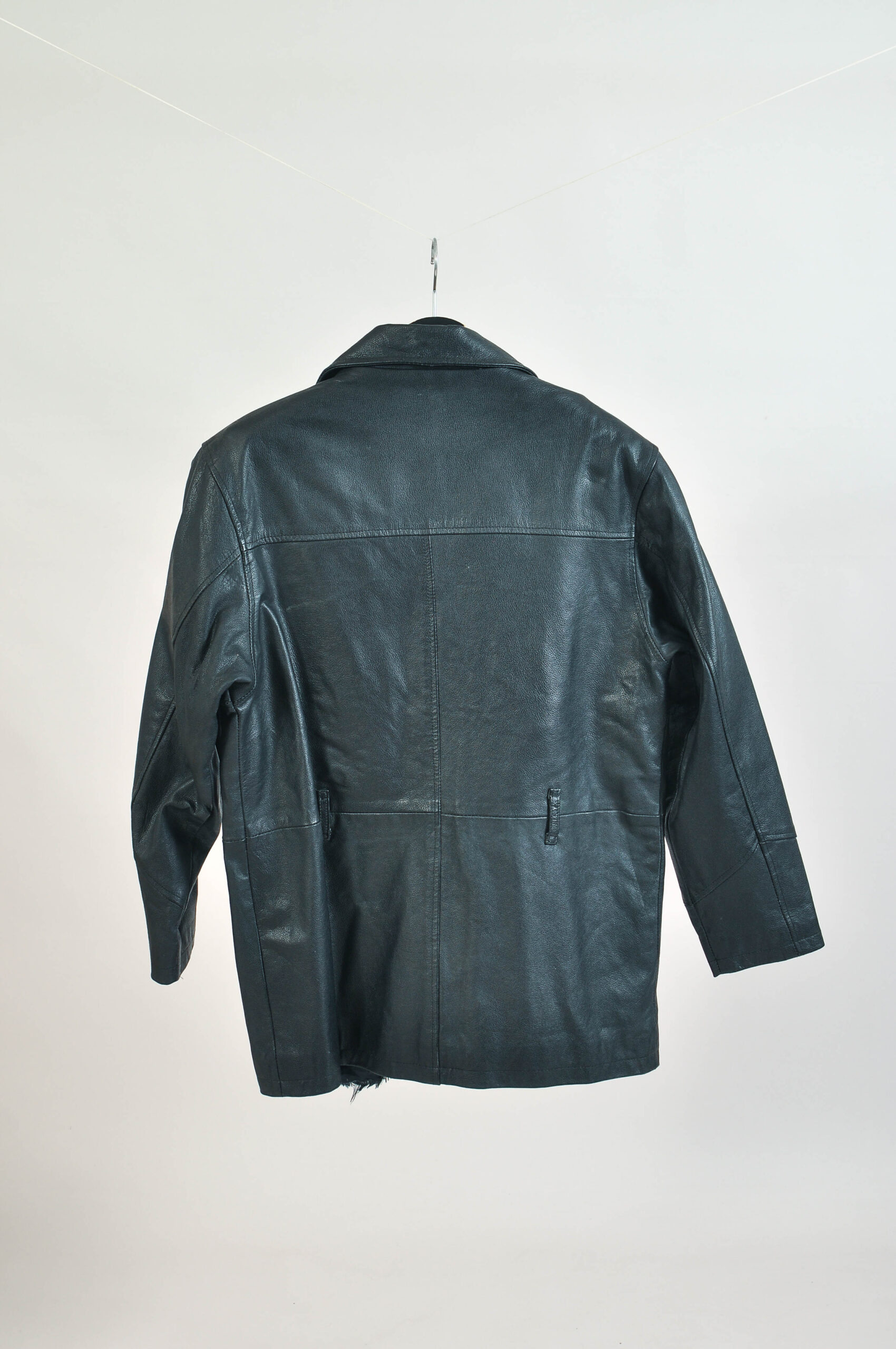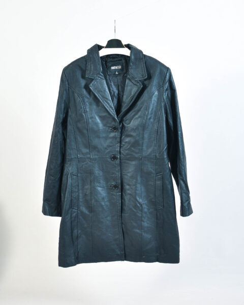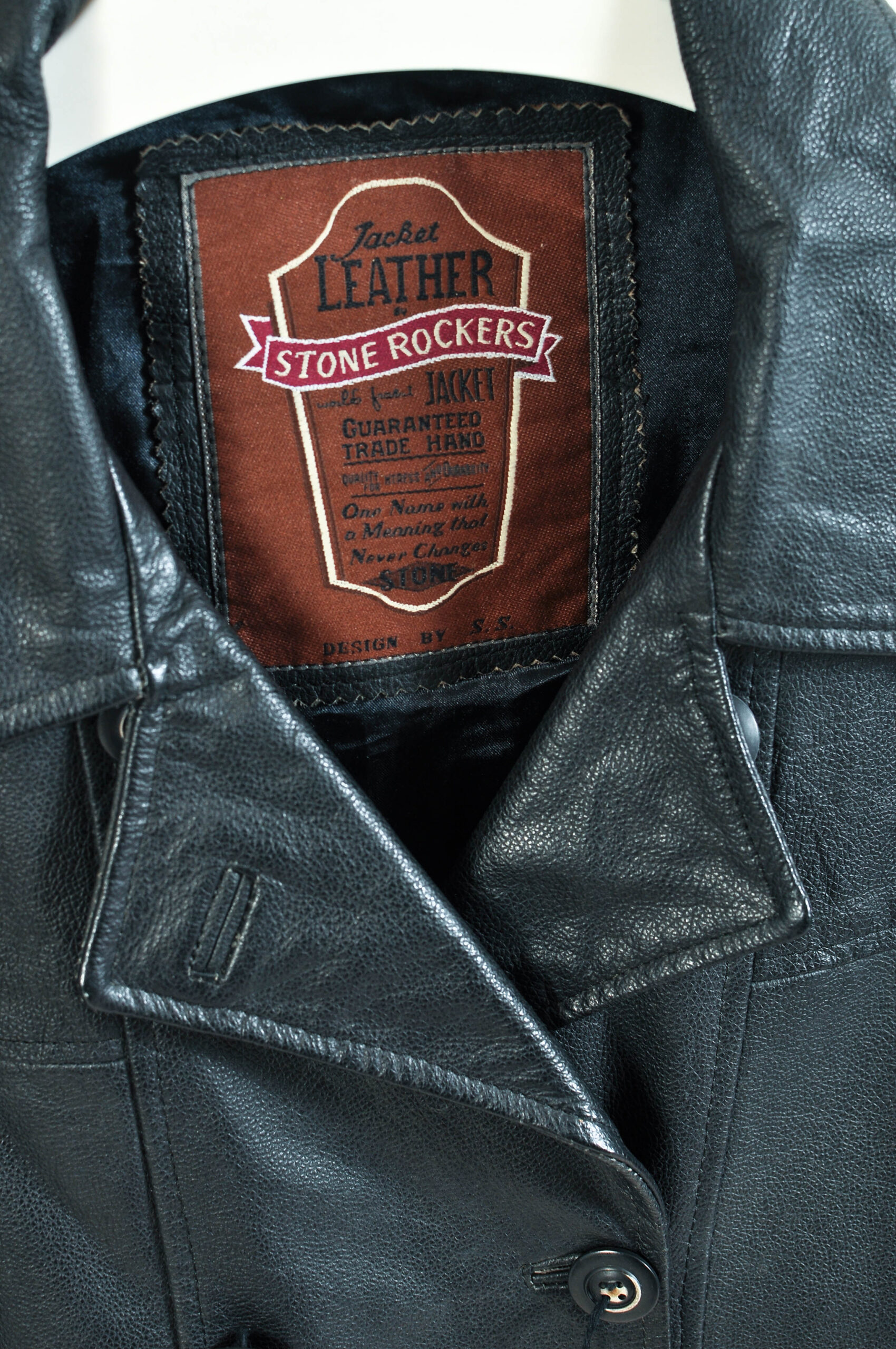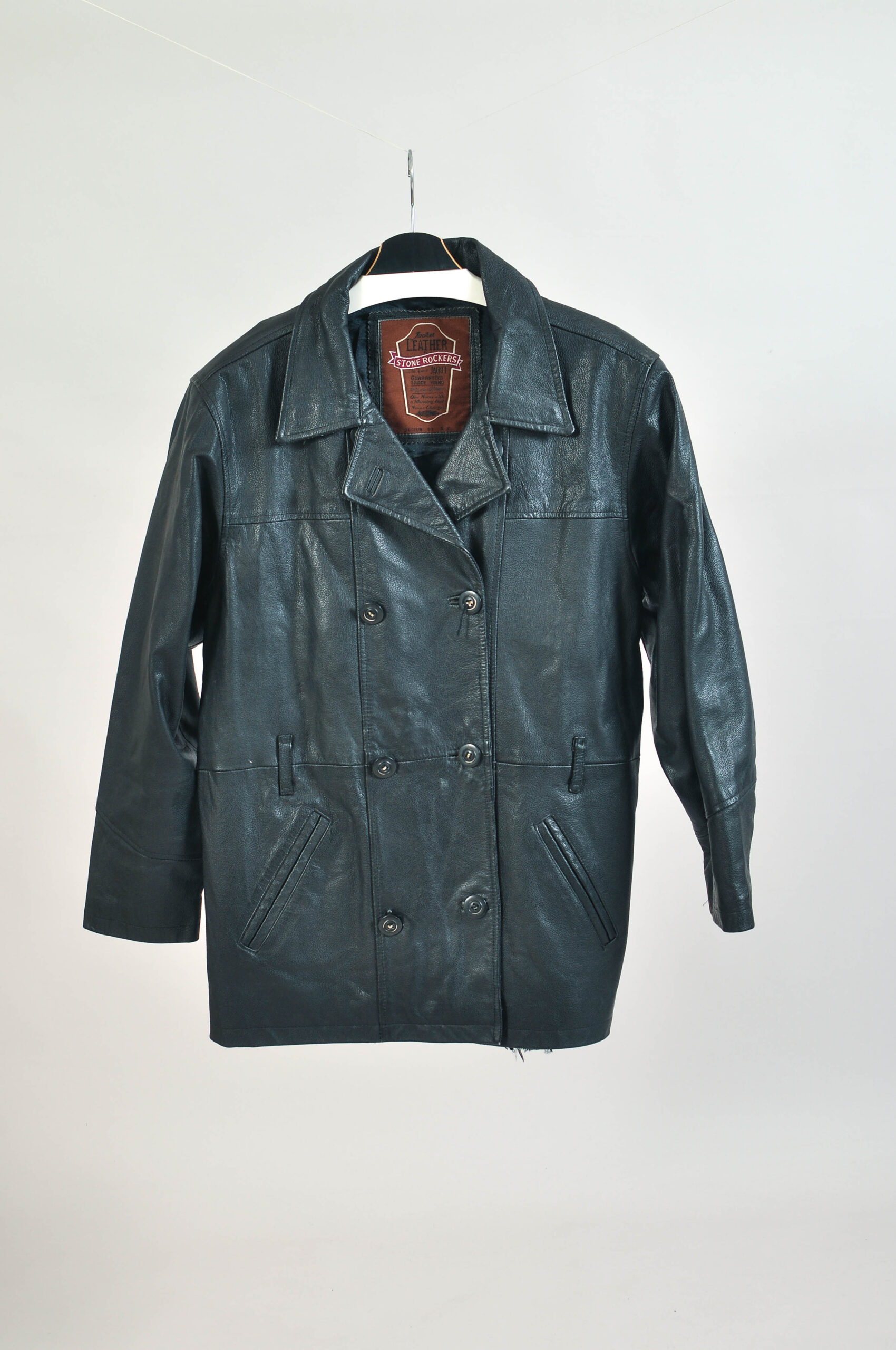 Classic vintage 90s double breasted leather coat by Stone Rockers featuring a bold structured silhouette typical of 1990s leather outerwear. The double-breasted design and genuine leather construction give this coat a timeless and durable vintage appeal.