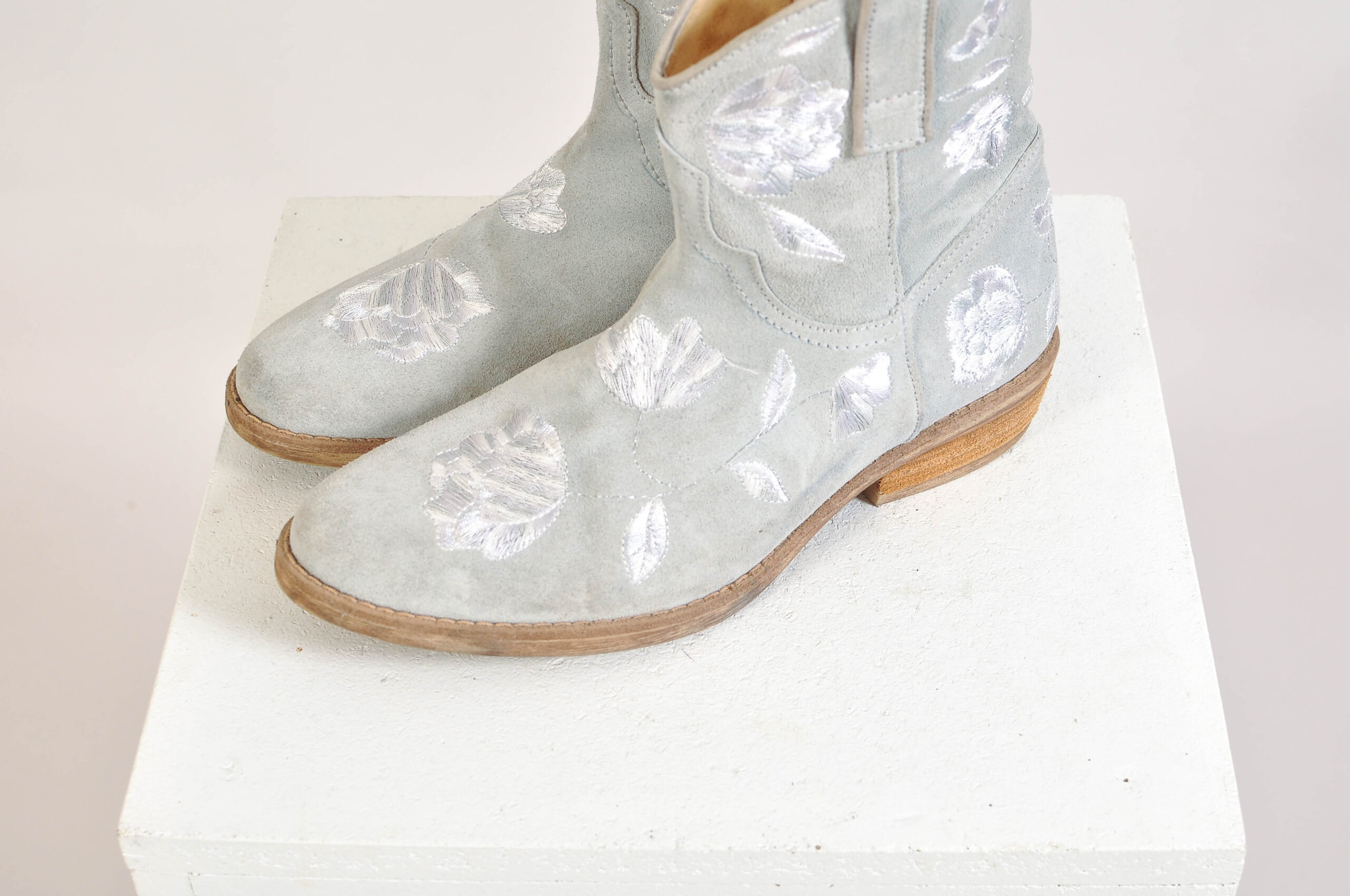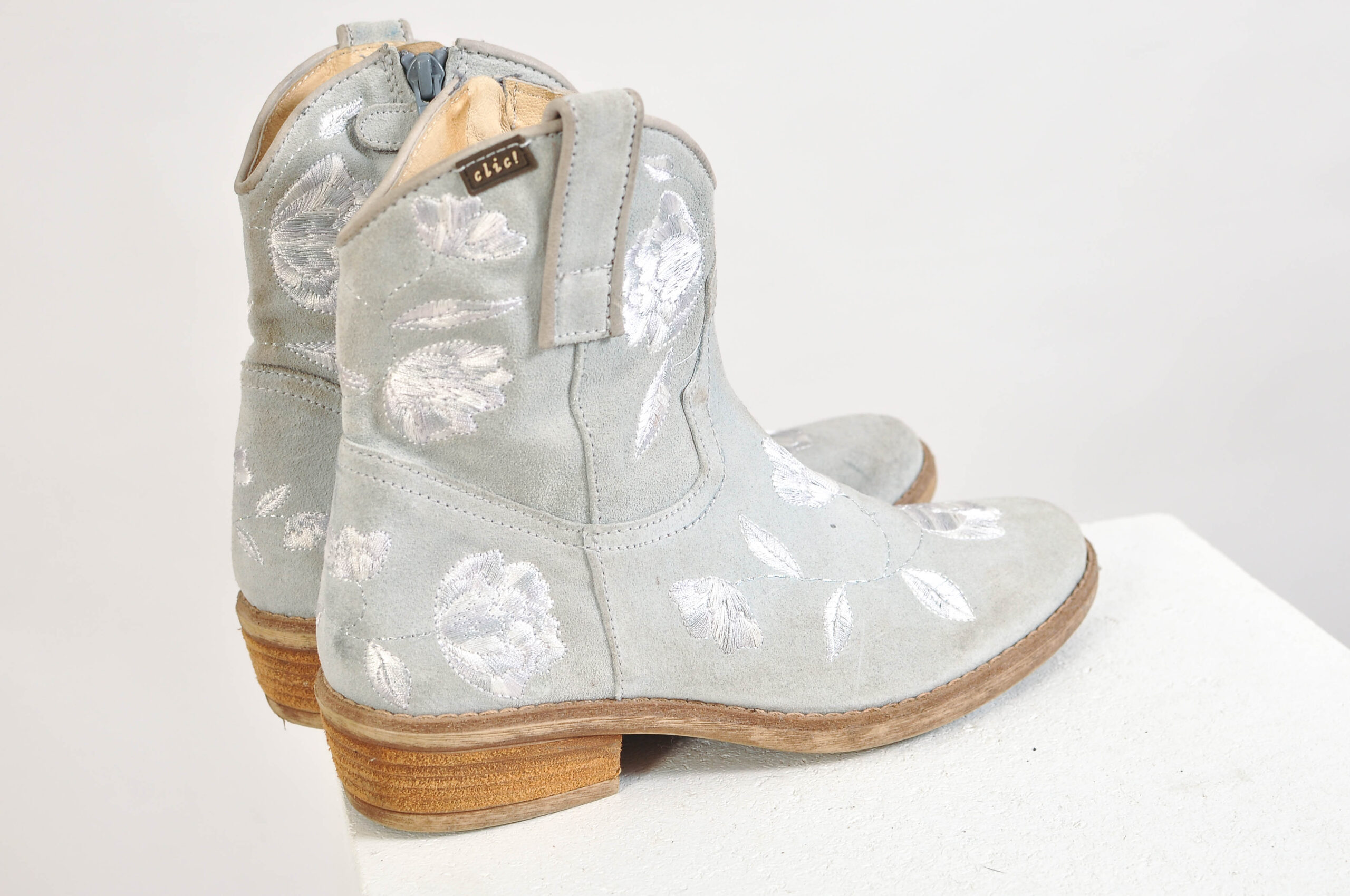 Step into timeless Western style with these vintage 90s suede leather cowboy boots in a beautiful light grey shade. Made from genuine suede leather, these boots feature a classic cowboy silhouette with a comfortable 3 CM heel – perfect for everyday wear or adding a statement touch to your outfit.