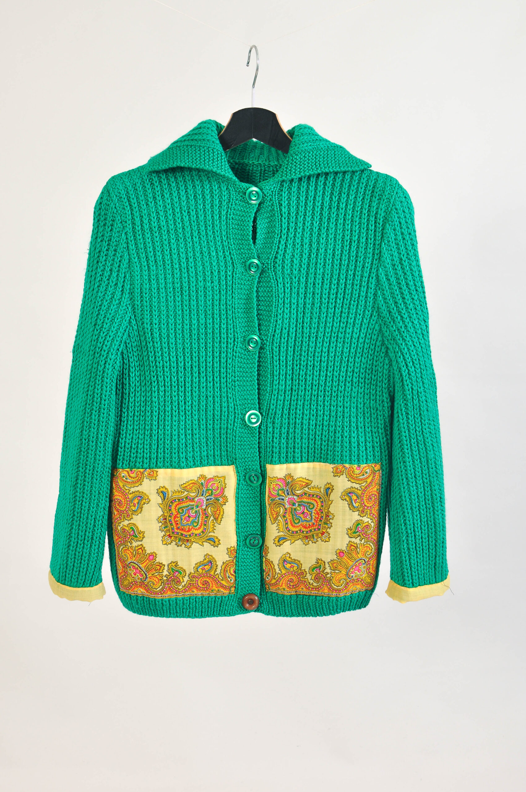 Add a touch of retro charm to your wardrobe with this vintage 90s upcycled green cardigan. Reworked with care, this piece blends sustainable fashion with cozy style. In very good vintage condition, it shows only natural signs of wear. No size tag, but best fits sizes S to M.