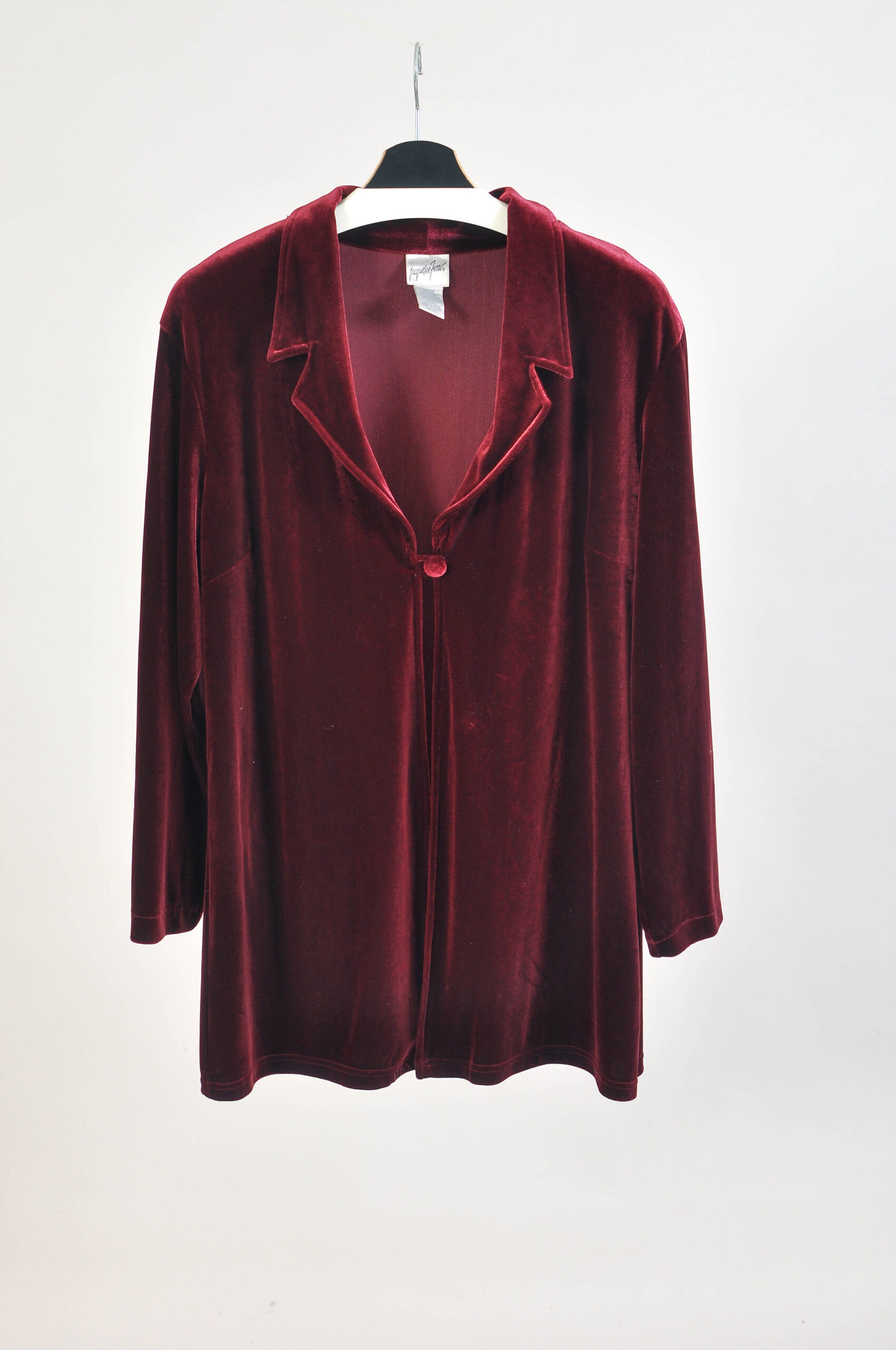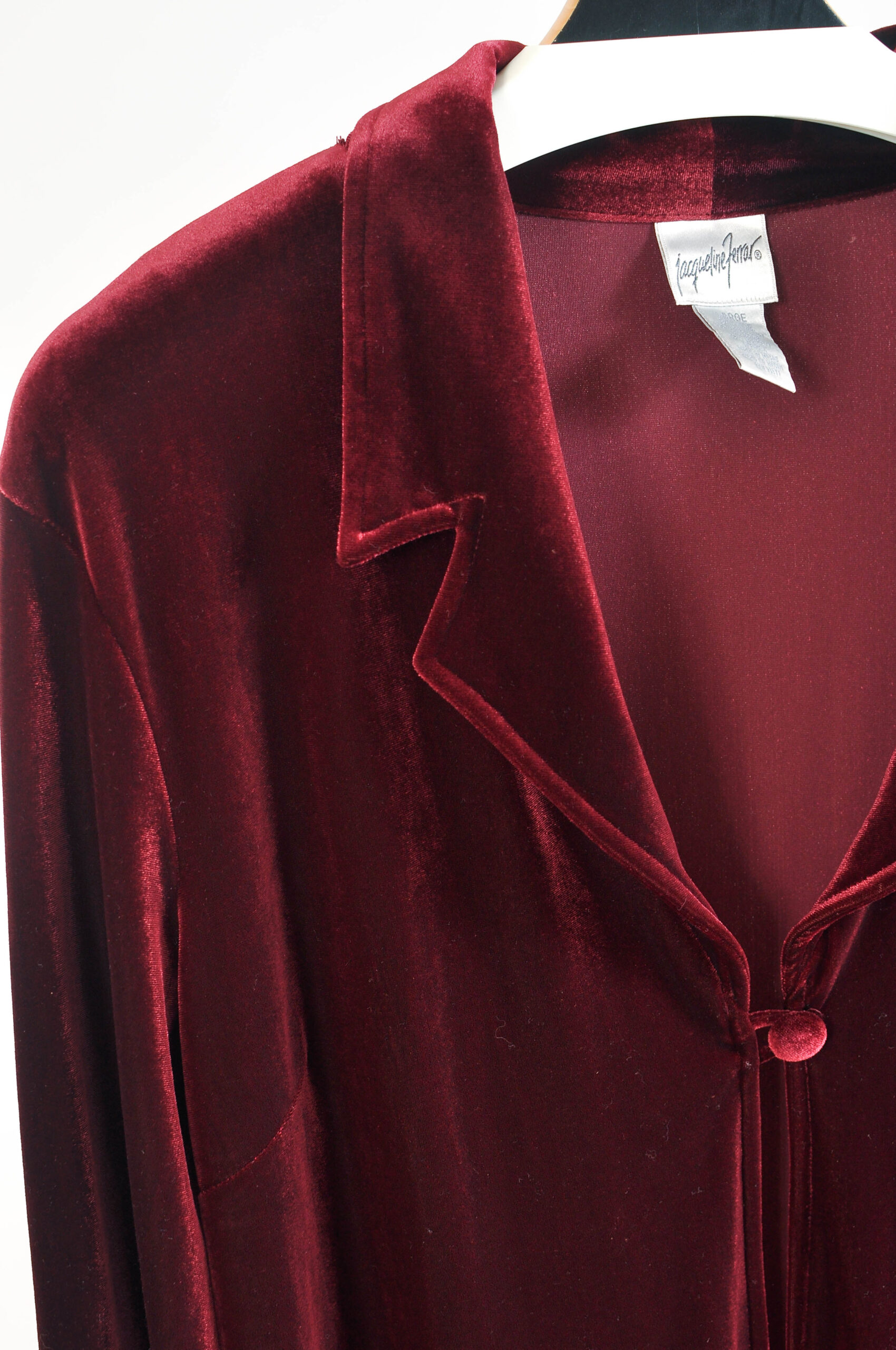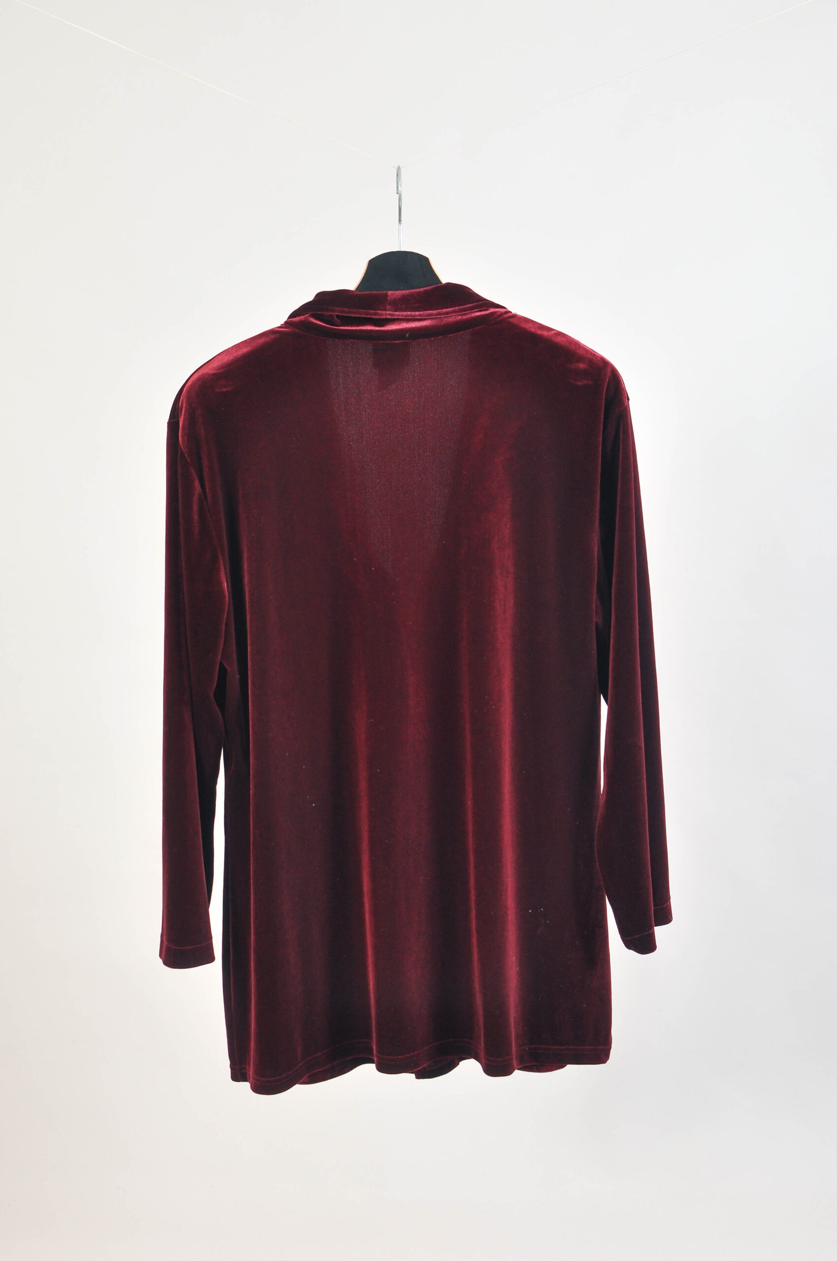 Elevate your style with this luxurious vintage 90s velvet kimono in a rich maroon hue. Perfectly suited for layering or standalone wear, this piece combines timeless elegance with a modern silhouette.