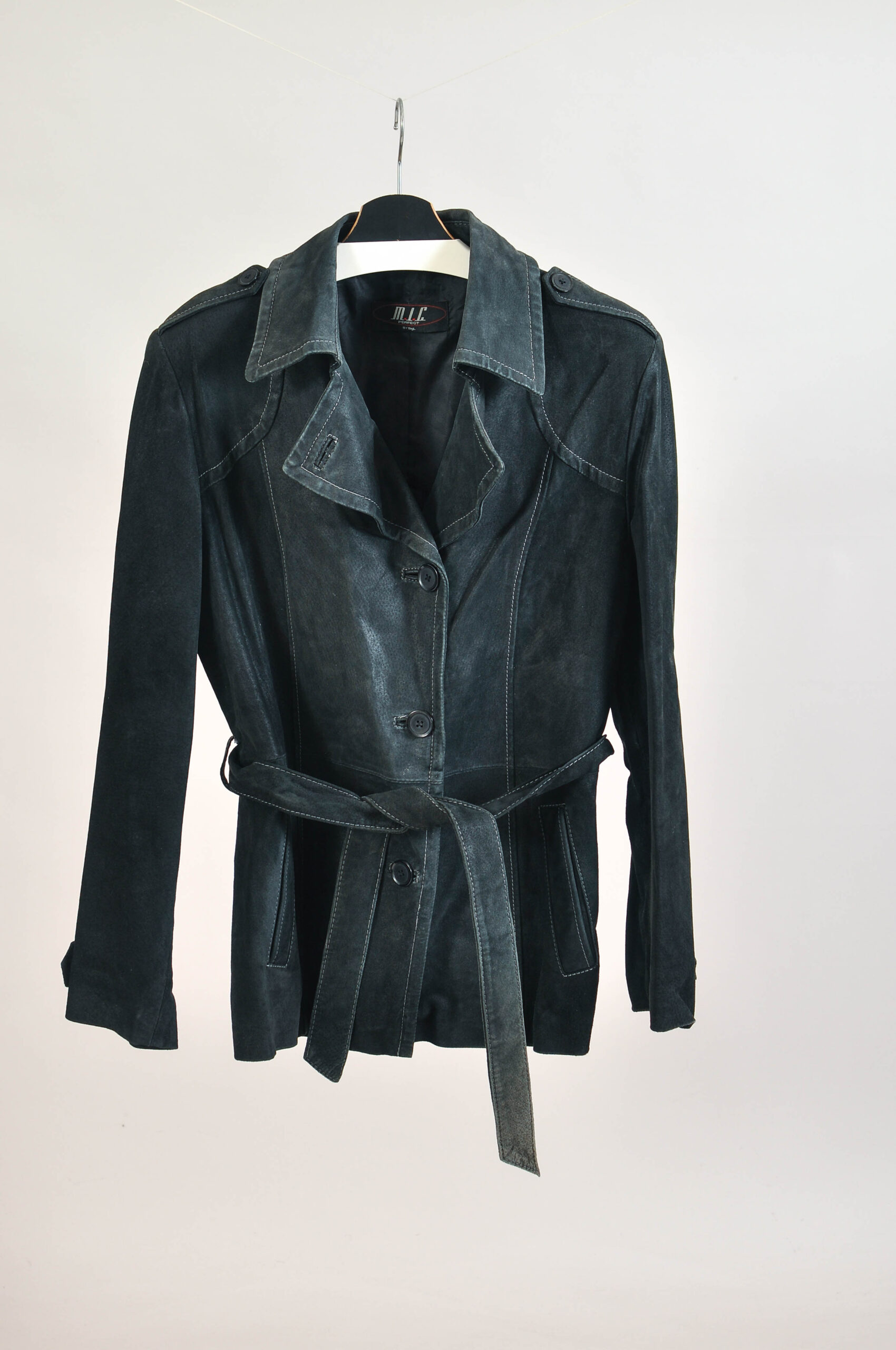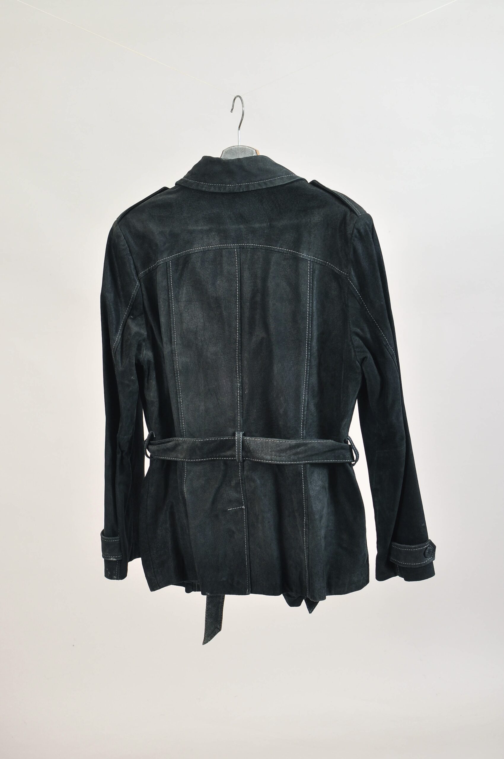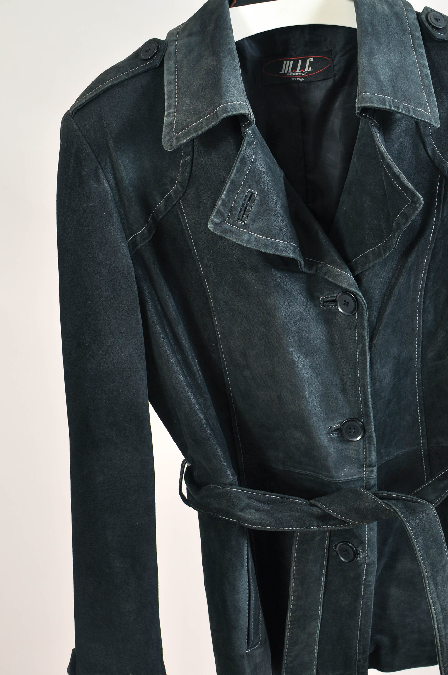 Timeless vintage Y2K black suede leather jacket by M.I.C featuring a clean silhouette and soft suede texture. A versatile outerwear piece that adds depth and understated edge to any outfit.